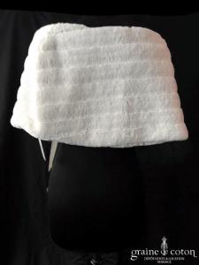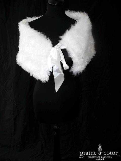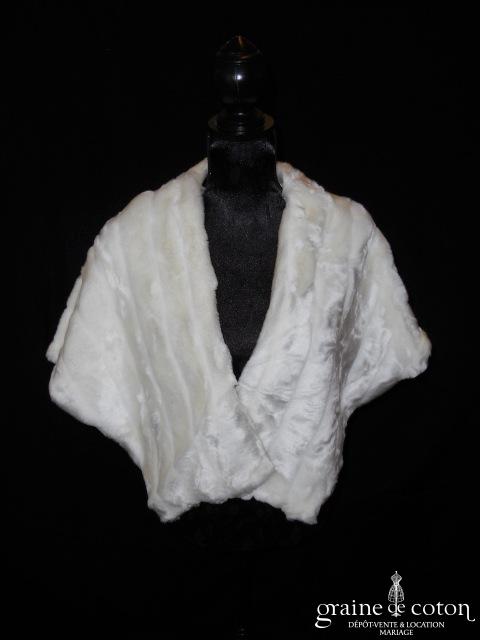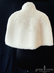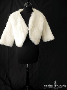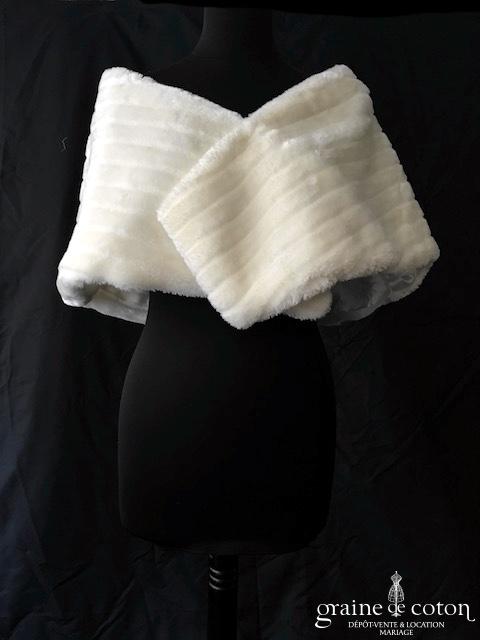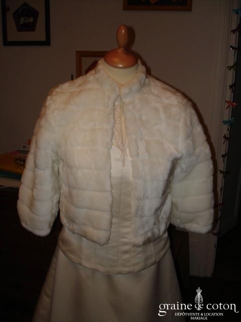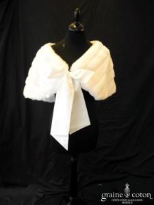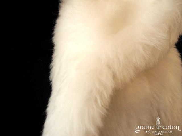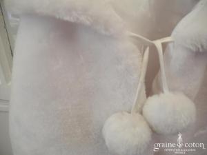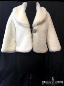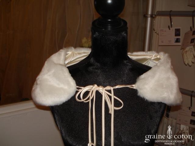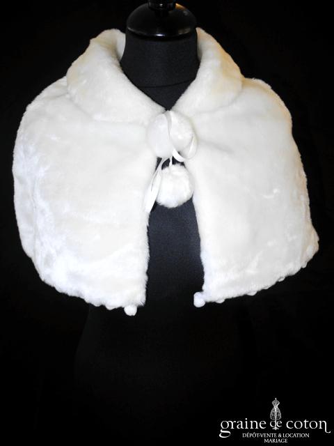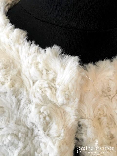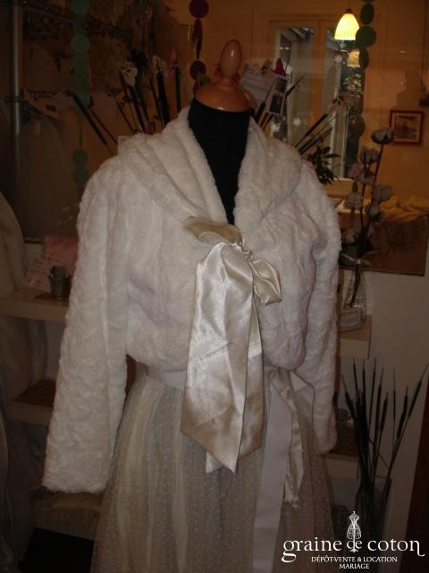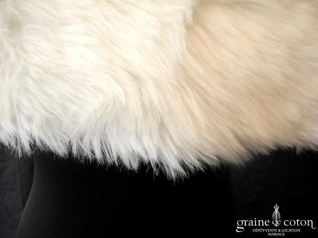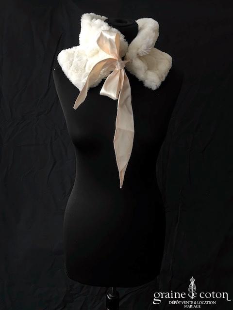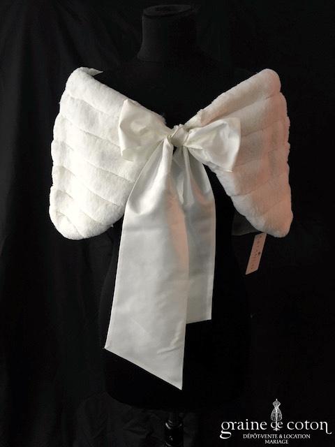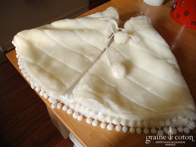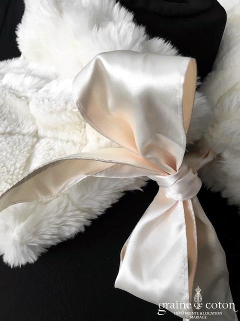 Boléro en fausse fourrure ivoire clair avec fermeture rubans de satin et pompons.