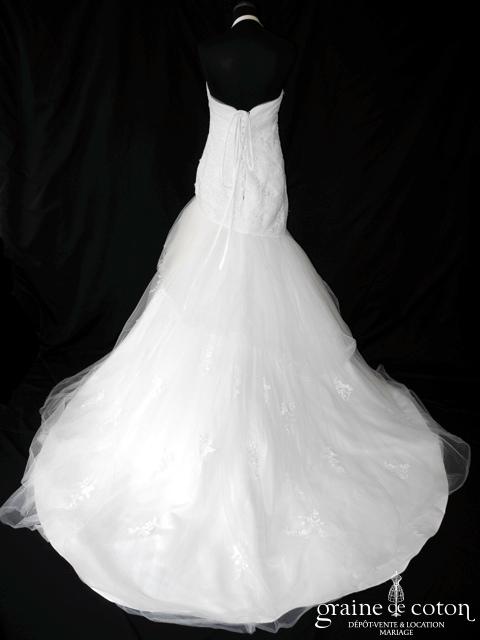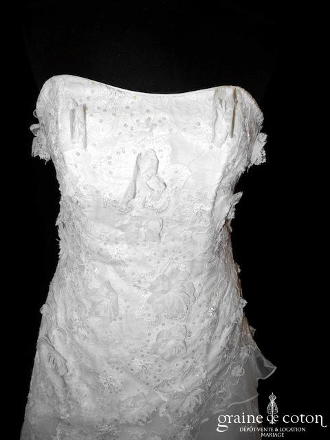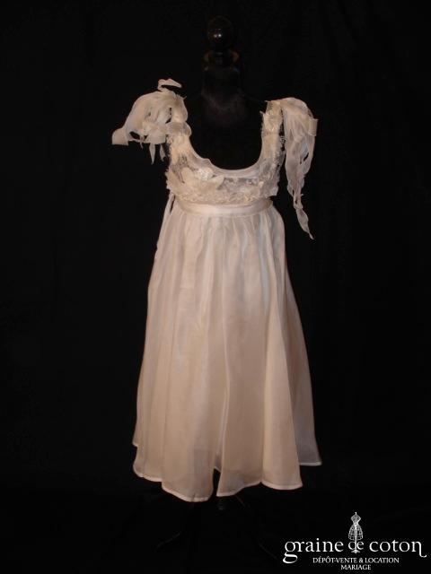 Robe une pièce ivoire clair : bustier en dentelle esprit champêtre avec petites fleurs. Jupe taille basse asymétrique en larges volants d’organza, très légère, petite traîne pouvant se relever par …