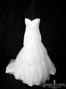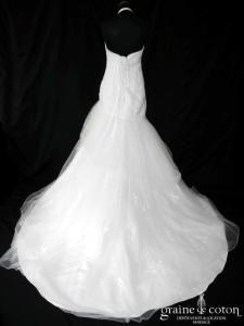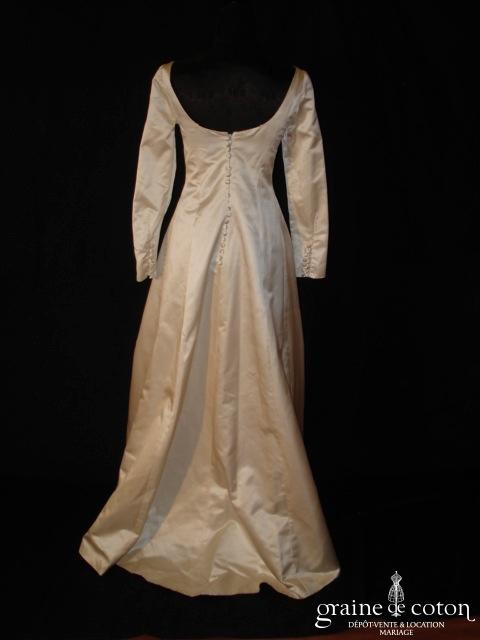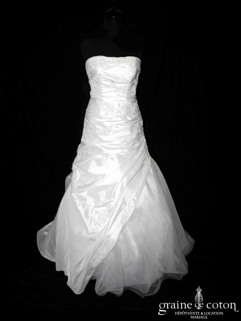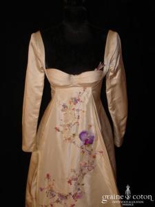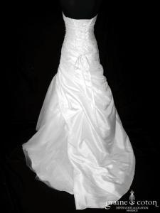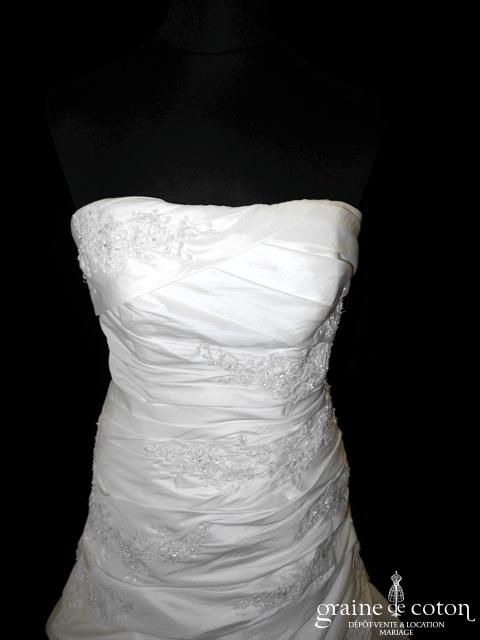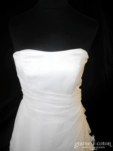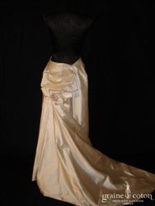 Robe une pièce en taffetas ivoire clair : bustier légèrement coeur, drapé et lacé dans le dos. Jupe évasée ouverte sur un volant de tulle, guipure de dentelle perlée sur …