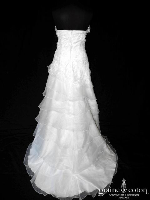 Robe une pièce en organza ivoire clair : bustier coeur drapé, dos lacé. Jupe trapèze formé de 3 rangées de larges volants d’organza parsemés de mini strass façon paillettes. Fraîche, …