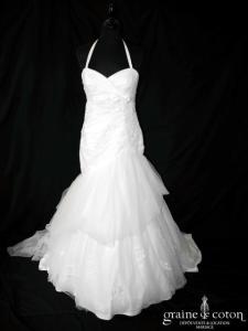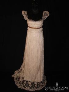 Robe une pièce en tulle et dentelle ivoire clair : bustier empire drapé de tulle, noeud pour souligner la coupe, dos lacé. Un tour de cou peut se rajouter par …