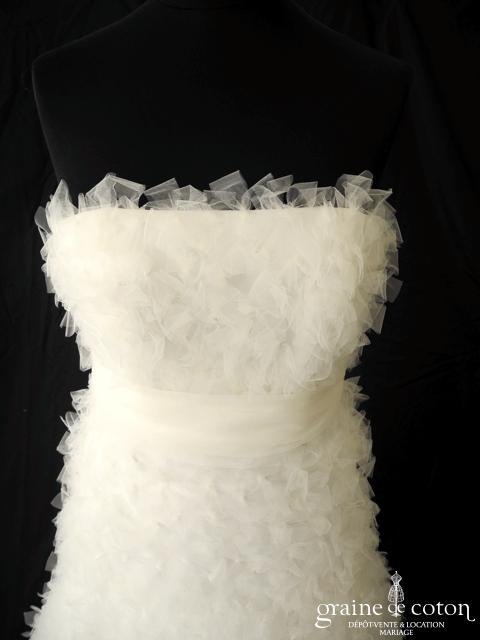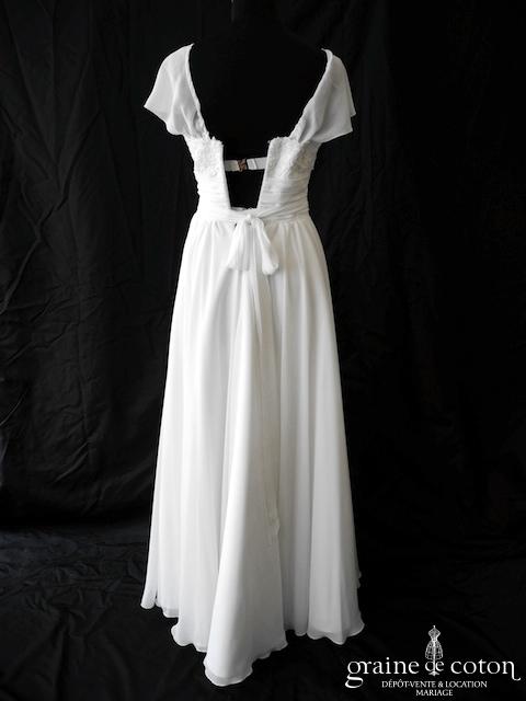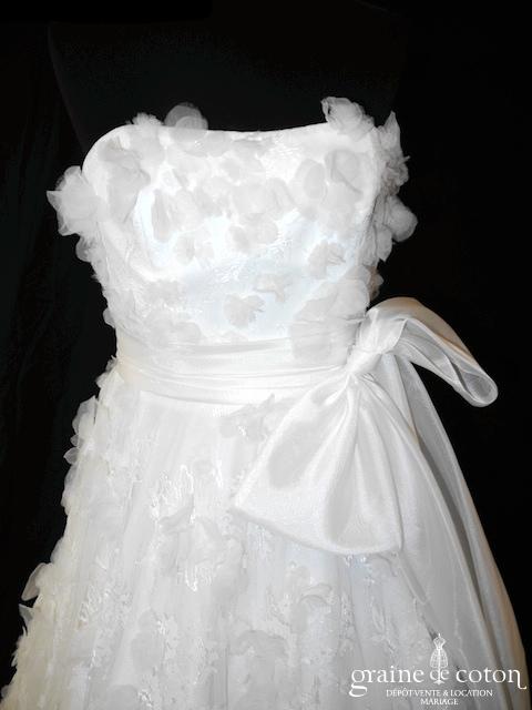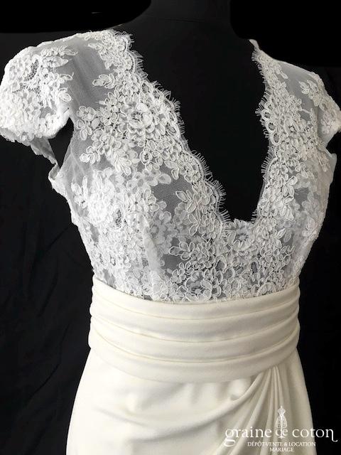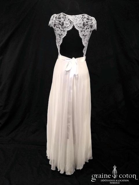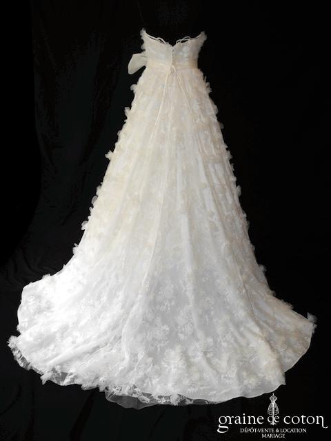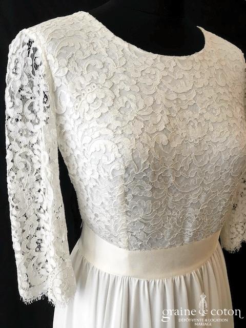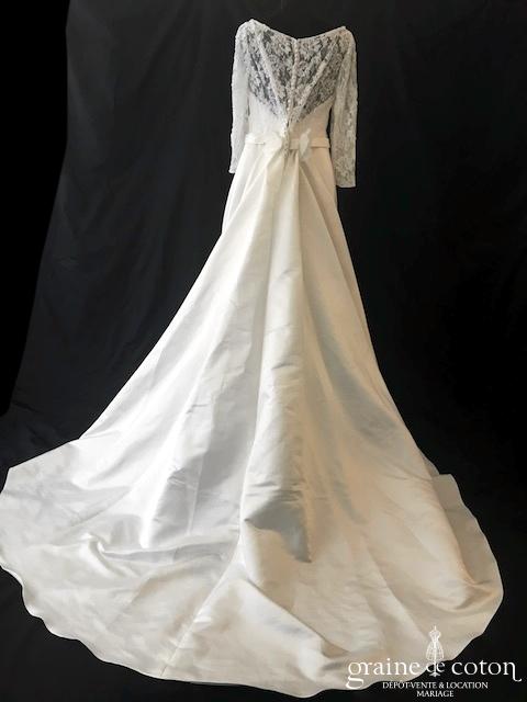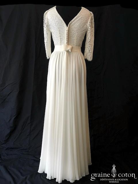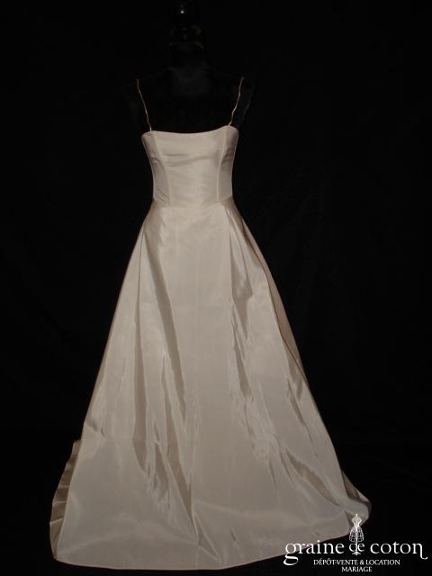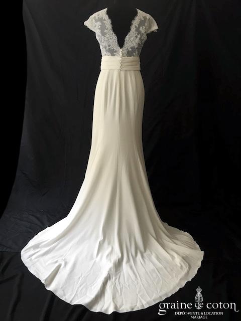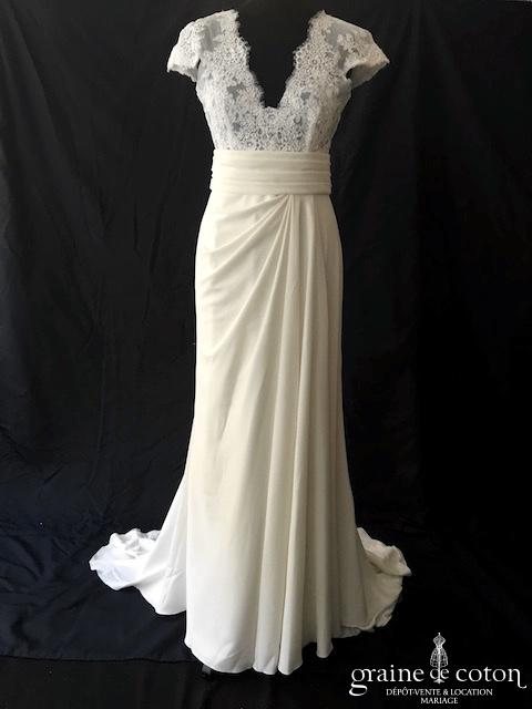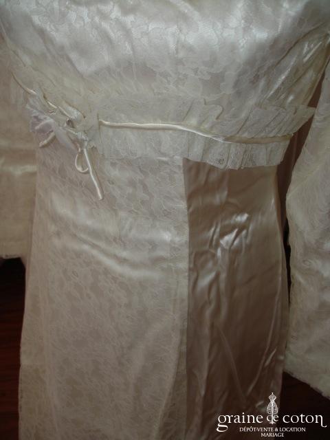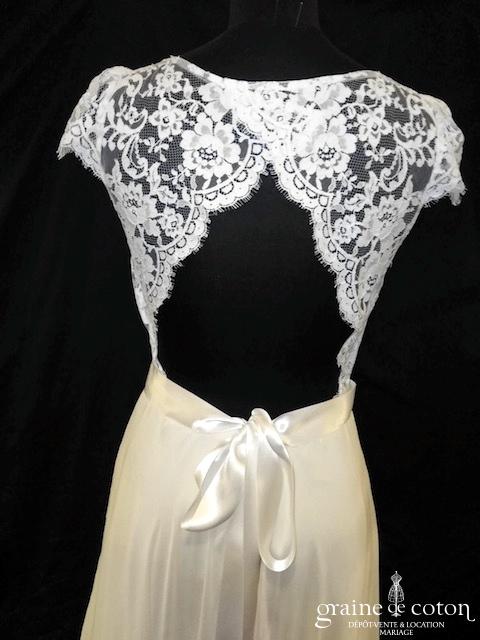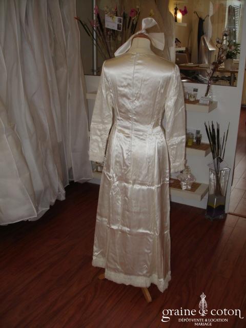 Robe une pièce en soie sauvage ivoire : décolleté tombant sur les épaules en un joli drapé, dos boutonné, jupe forme trapèze avec petite traîne qui se relève grâce à …