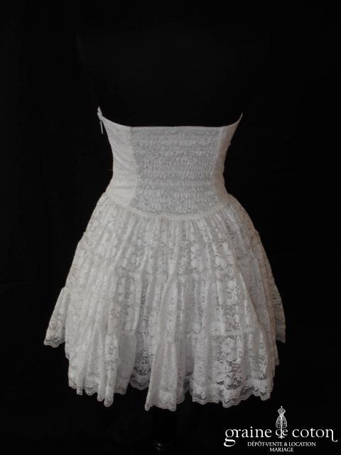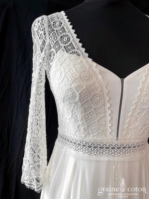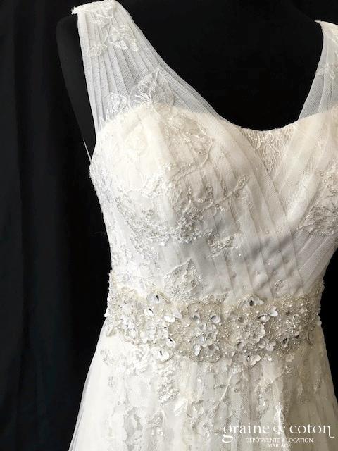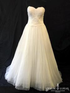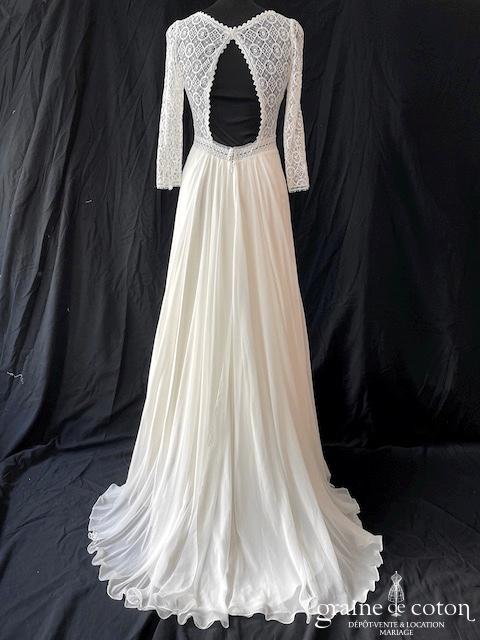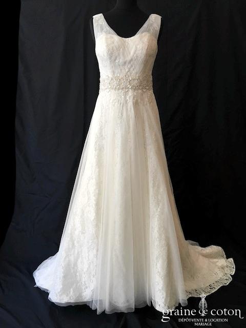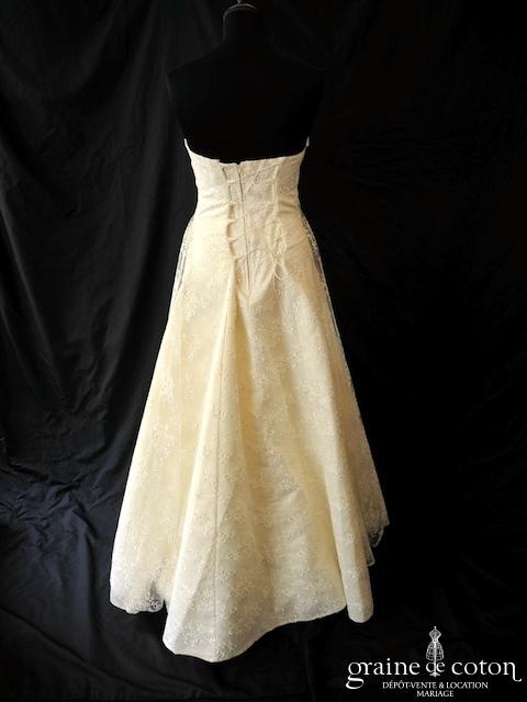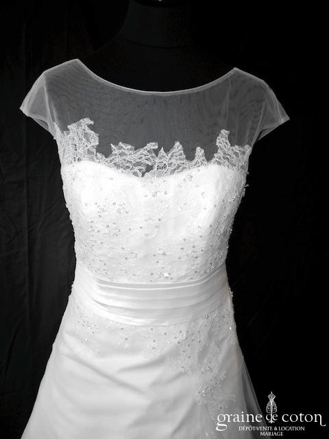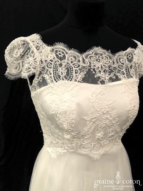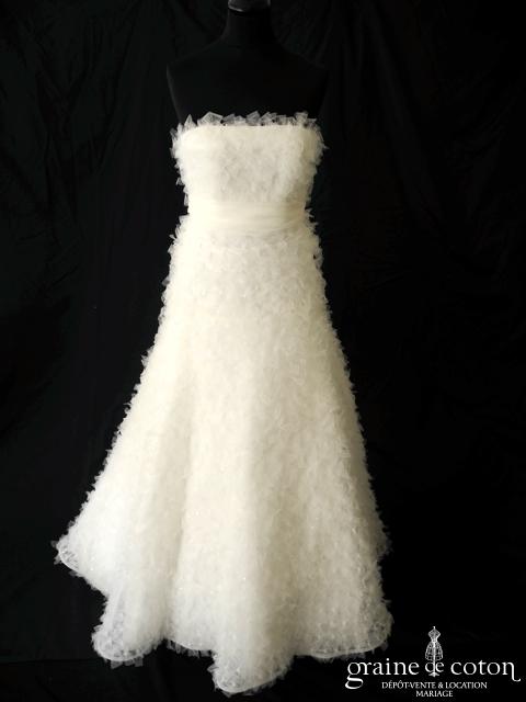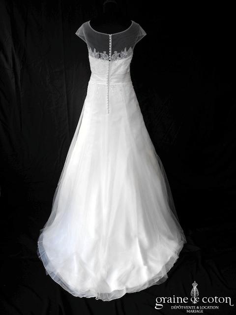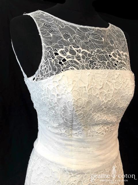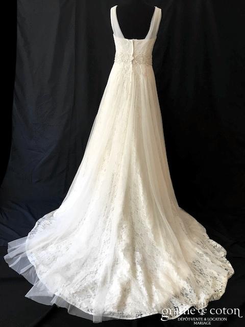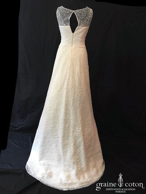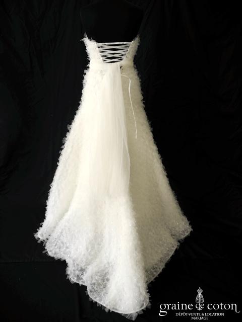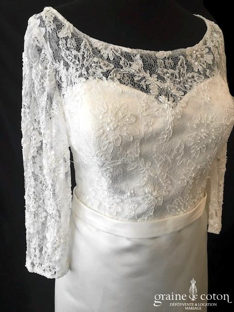 Robe une pièce en soie sauvage ivoire : décolleté tombant sur les épaules en un joli drapé, dos boutonné, jupe forme trapèze avec petite traîne qui se relève grâce à …