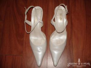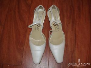 Escarpins blanc perle nacré à lanières et bout carré. Talon de 7 cm. Intérieur et extérieur en cuir, semelle synthétique.
