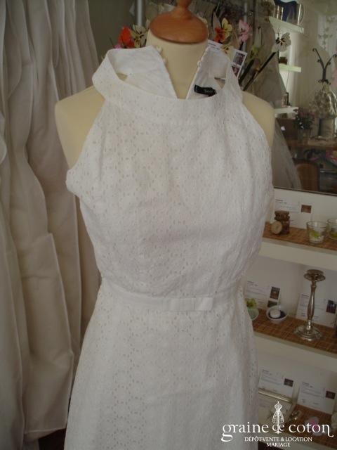 Robe très fraîche en coton ajouré blanc. Ceinture blanche avec petit noeud à la taille, encolure servant également de bretelles, jupe forme trapèze.