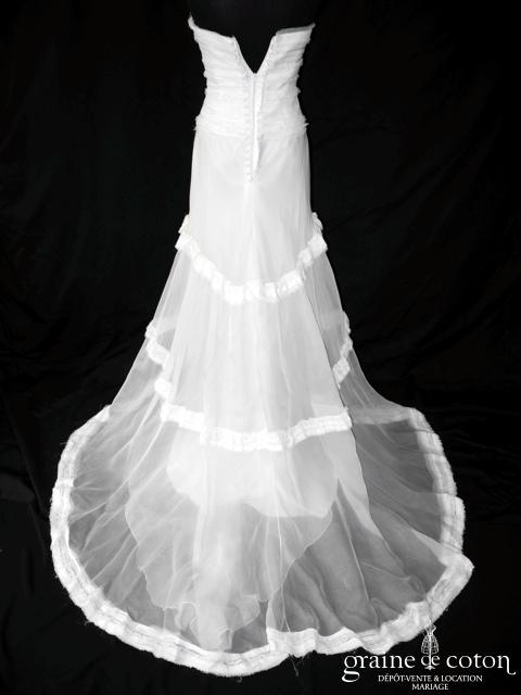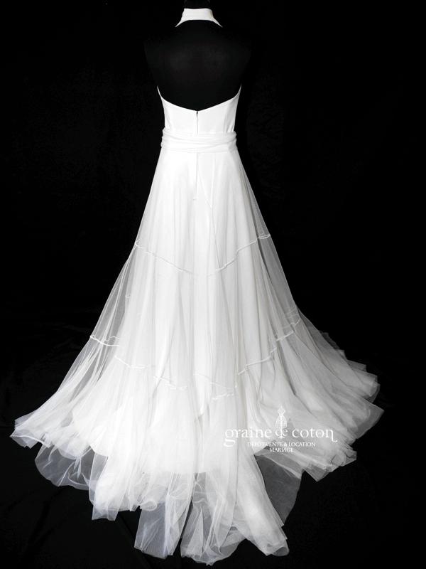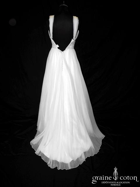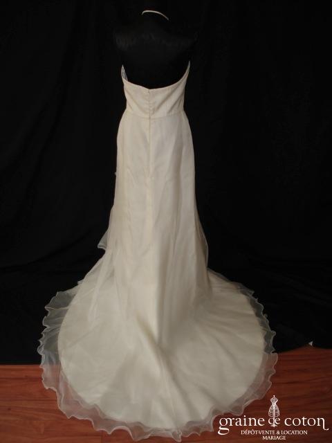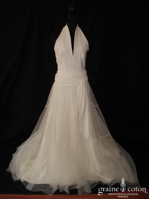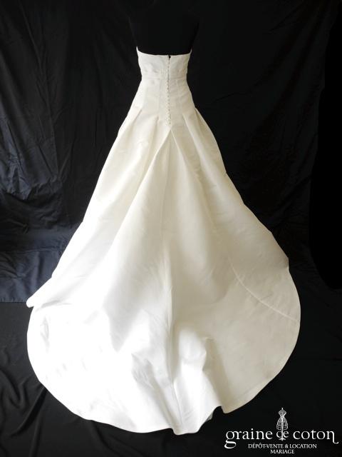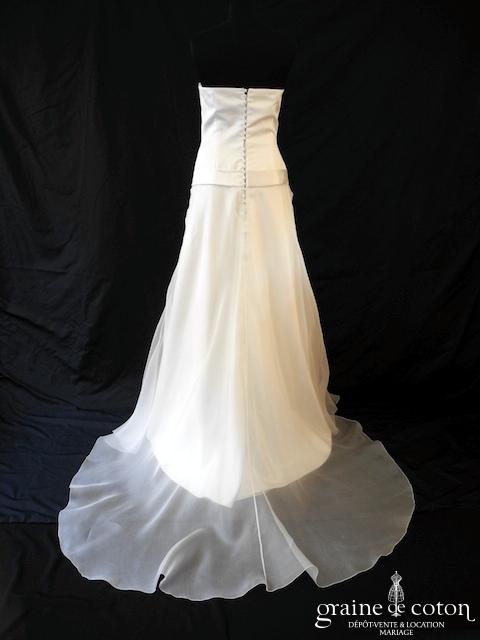 Robe une pièce en satin ivoire clair : bustier drapé en V avec bretelles, dos nu en V. Petite ceinture de dentelle sur le dos, dirscrète et délicate. Jupe fluide …