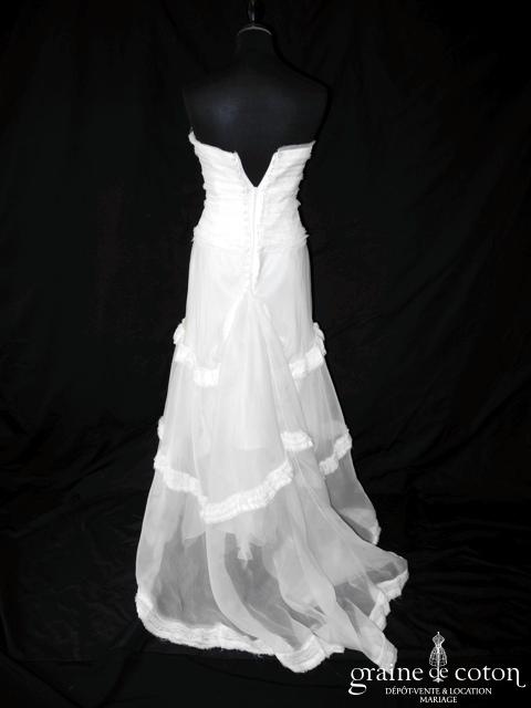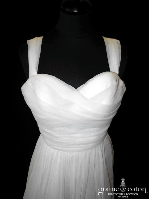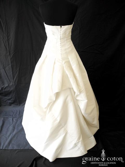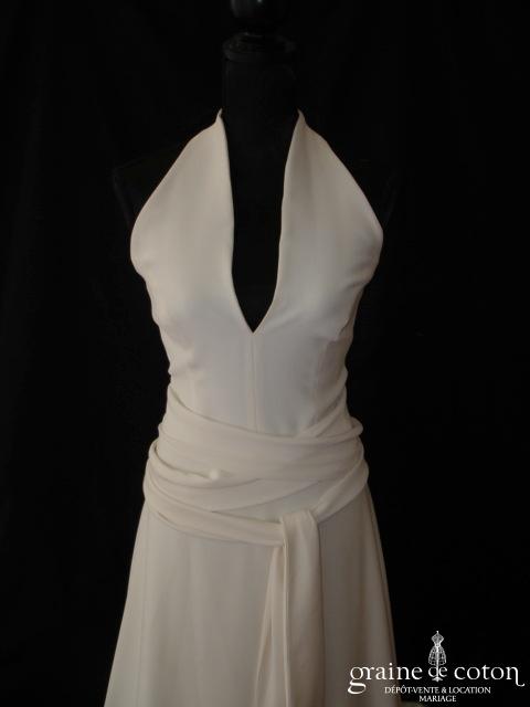 Robe une pièce ivoire clair tout en mikado gaufré : top encolure américaine ouvert, dos nu. Jupe taille haute avec large empiècement, légèrement évasée avec traîne et poches. Ligne pure …