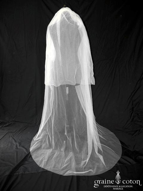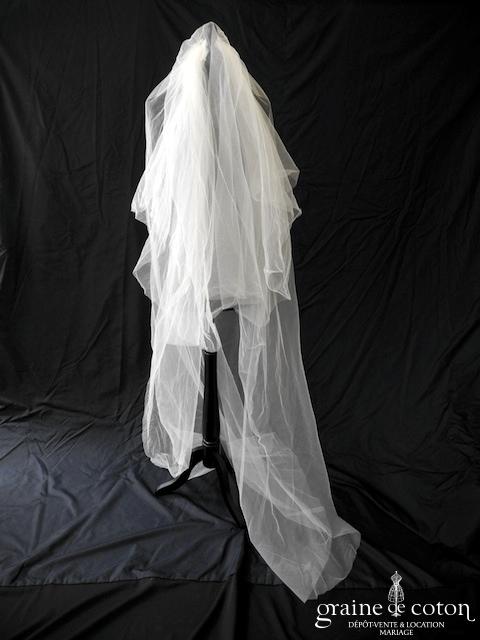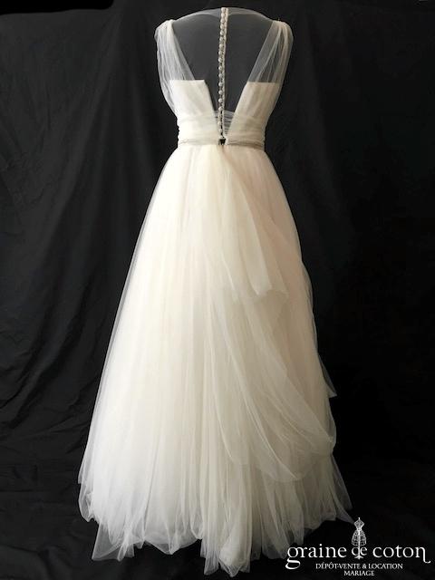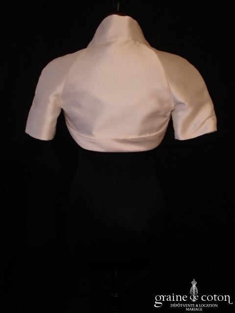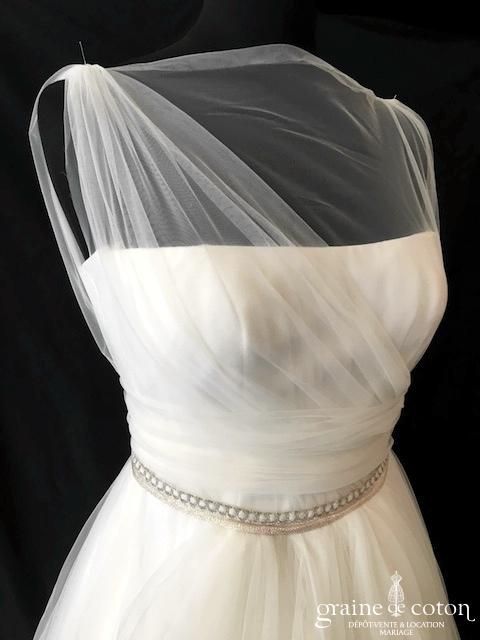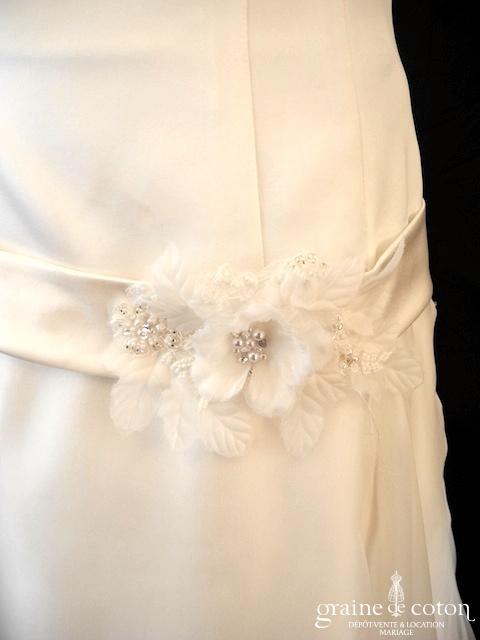 Robe une pièce tout en crêpe de soie ivoire clair : top col montant avec petotes manches, dos complètement fermé. Ceinture strassée à la taille que l’on peut retirer/remplacer. Jupe …