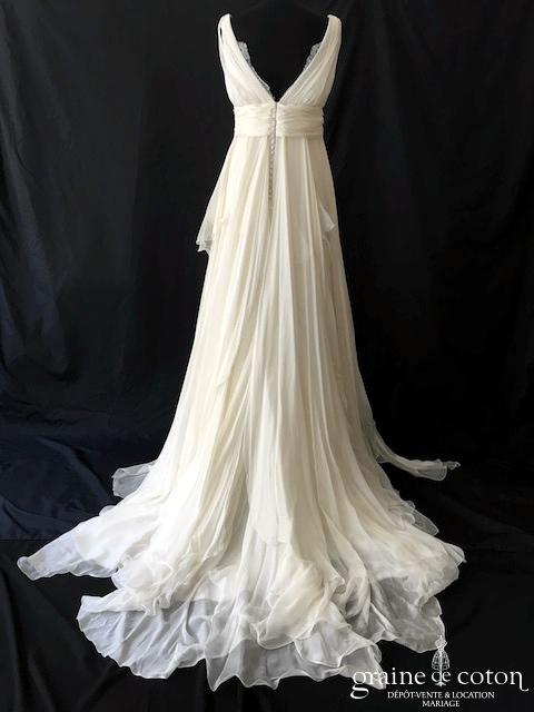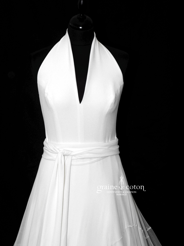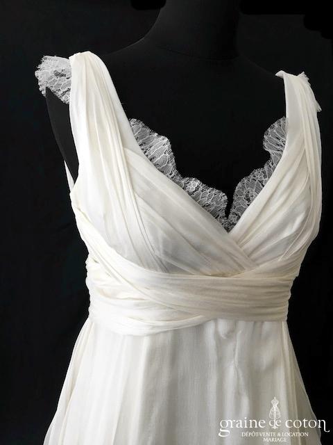 Robe une pièce tout en satin duchesse ivoire : bretelles et col fendu, dos largement échancré en V et bordé de fine dentelle de Chantilly. Taille ceinturée avec noeud devant. …