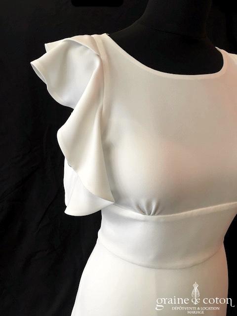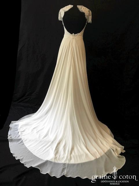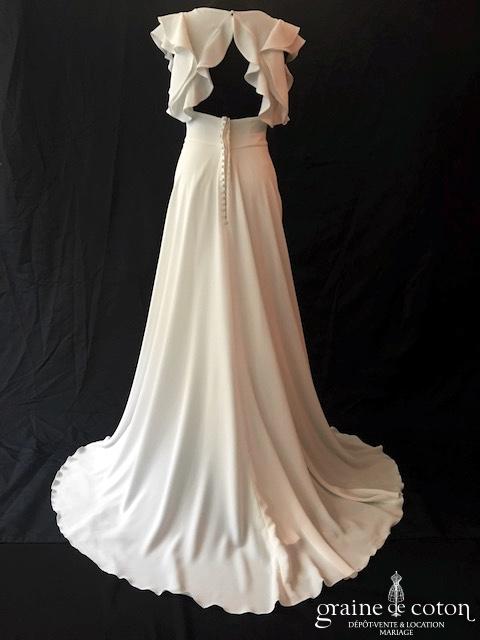 Robe ivoire clair en deux parties : top court en dentelle de Chantilly doublée, manches 3/4 et dos nu. Jupe ronde taille haute en crêpe fluide et épuré avec petite …