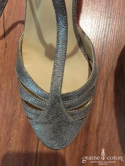 Escarpins ivoires en cuir doré et caramel, bouts ouverts. Talon de 9 cm.