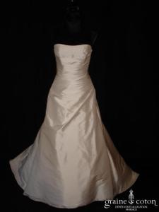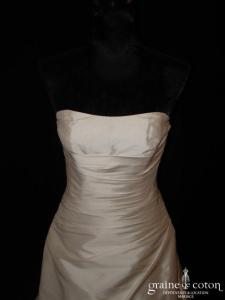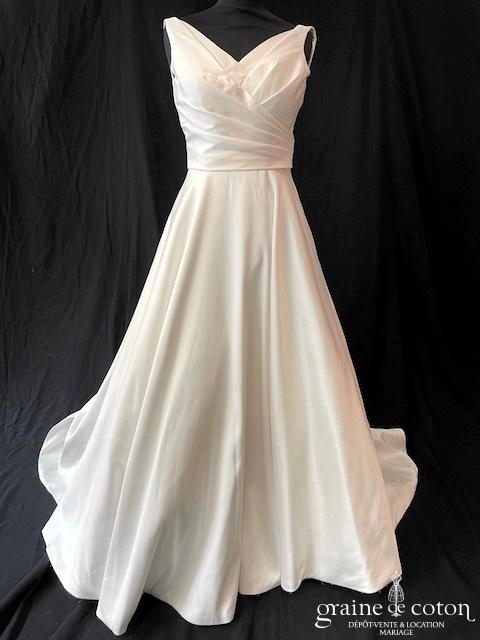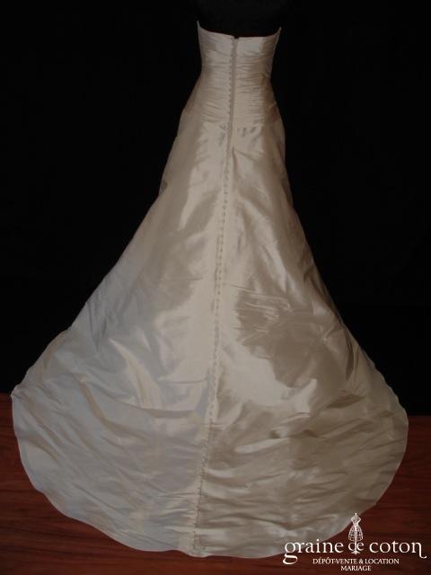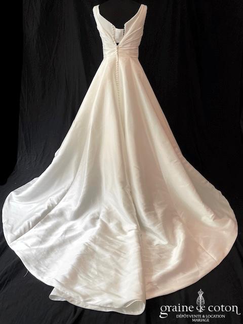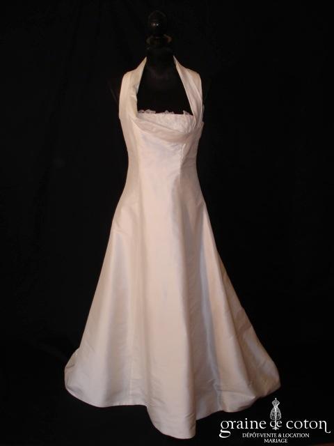 Robe une pièce tout en mikado ivoire clair : top drapé décolleté V drapé, dos nu en V. Jupe taille haute évasée, avec poches et traîne. Classe et intemporelle.
