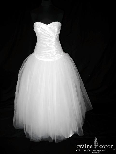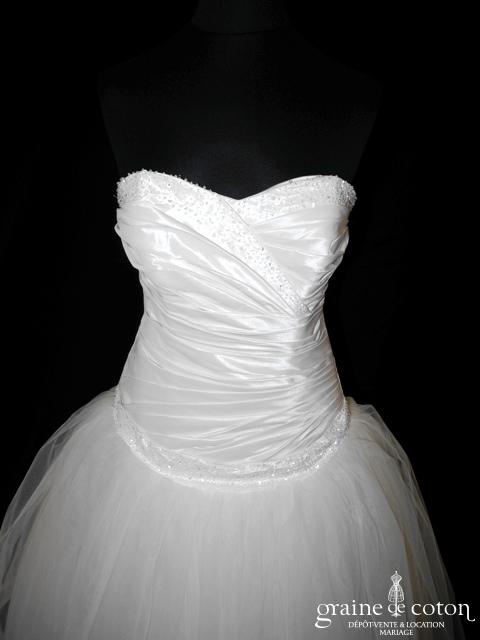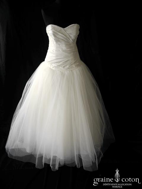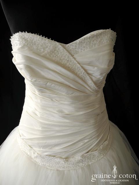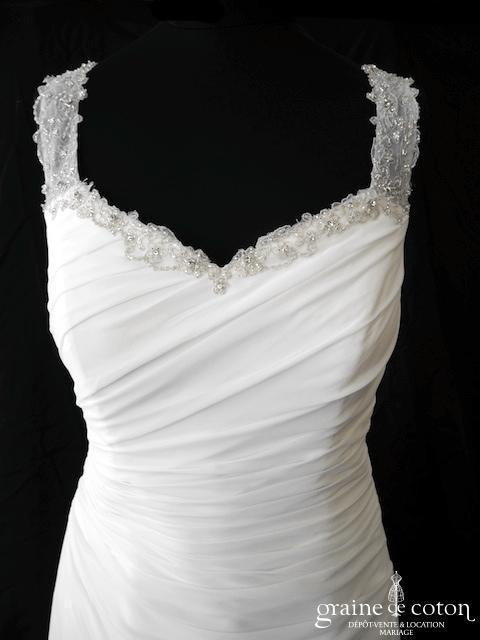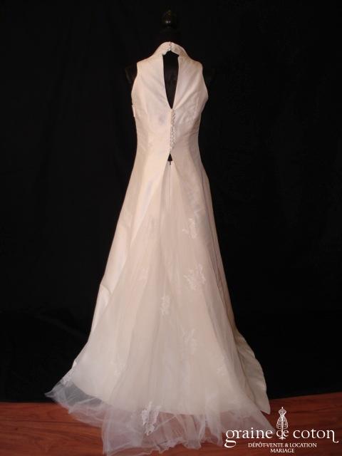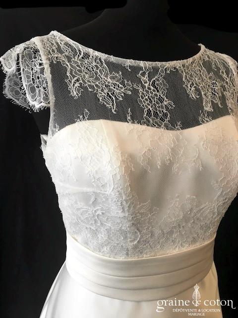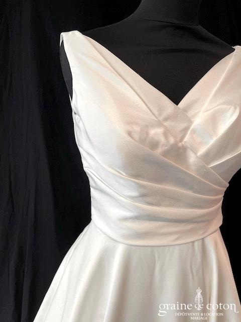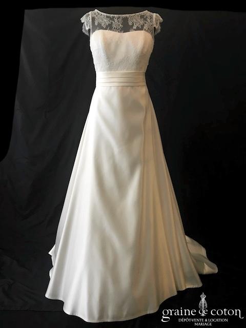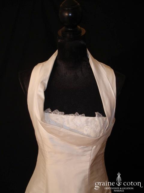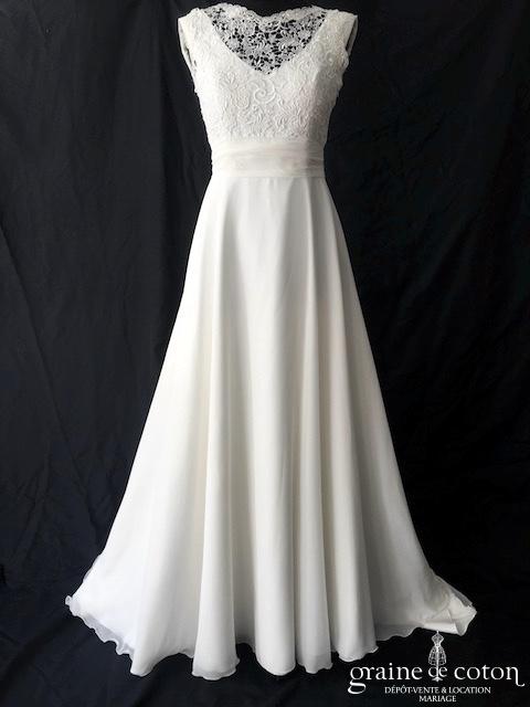 Robe deux pièces ivoire clair : top avec larges bretelles et décolleté V, dos échancré. Possibilité d’ajouter un haut en guipure ou dentelle (référence 4943 présentée en photos). Ceinture plissée …