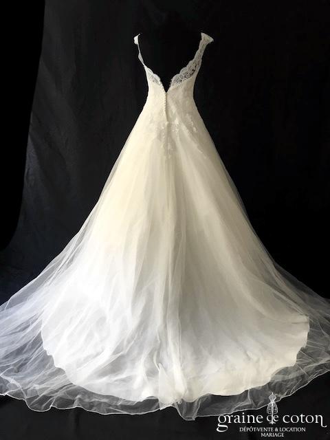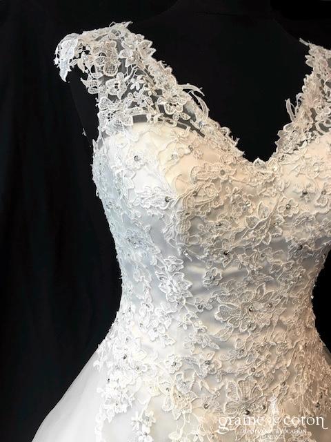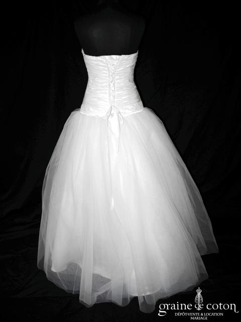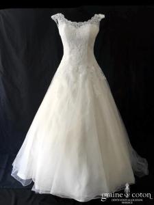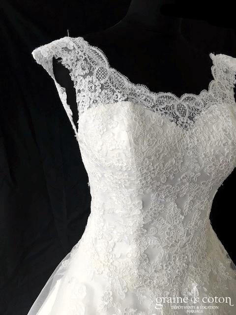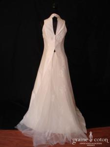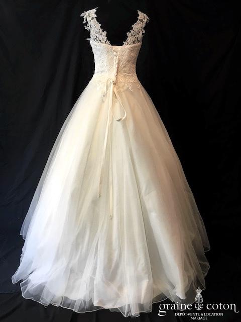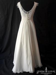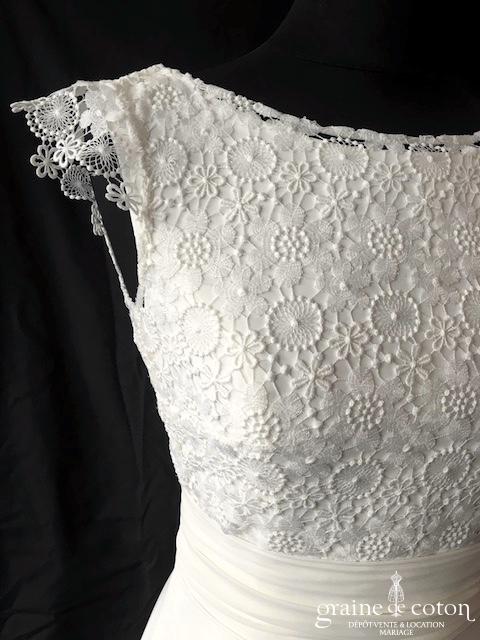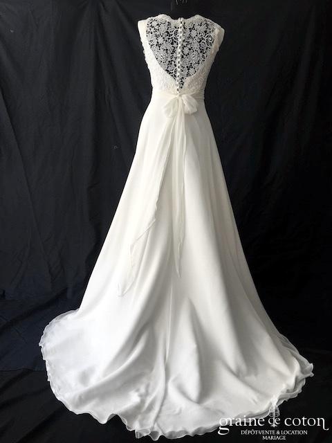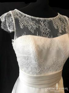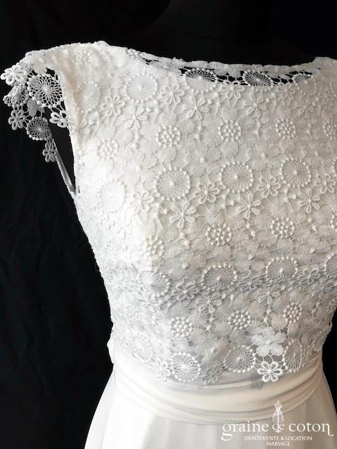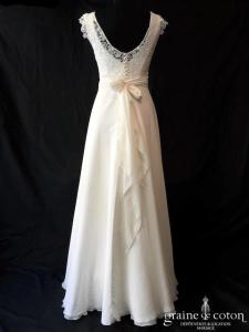 Robe deux pièces ivoire clair : haut avec larges bretelles et top amovible en guipure, dos boutonné. Ceinture plissée à boutons avec pans de mousseline amovibles. Jupe taille haute en …