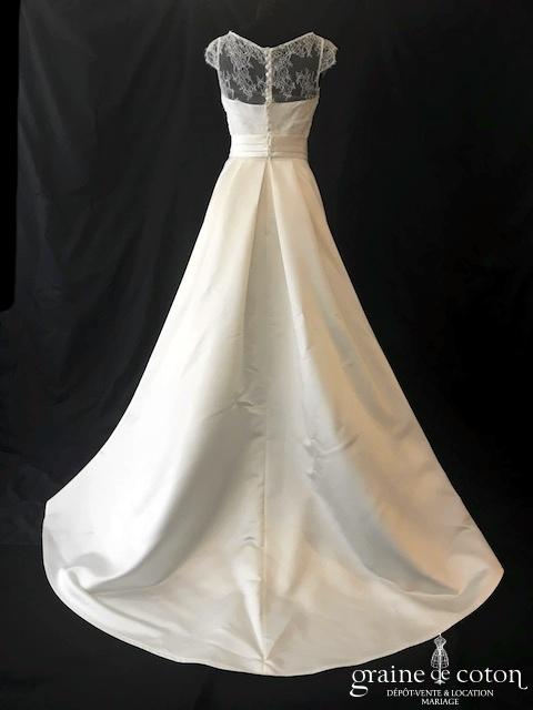 Robe une pièce tout en mikado ivoire clair : top avec encolure bateau, dos boutonné. Jupe taille haute évasée avec poches et petite traîne. Épurée, élégante et classe.