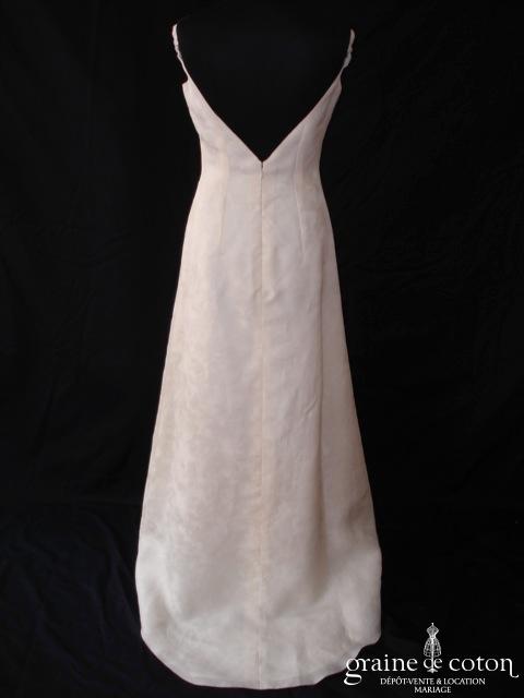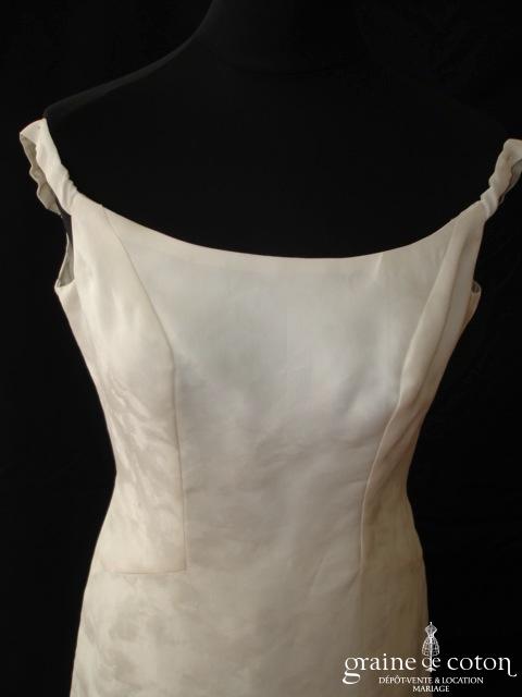 Robe une pièce en soie ivoire avec reflets satinés : un beau modèle épuré avec bretelles sur le coin des épaules, bustier ajusté et jupe trapèze très légèrement évasée. Dos …