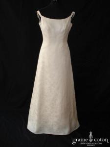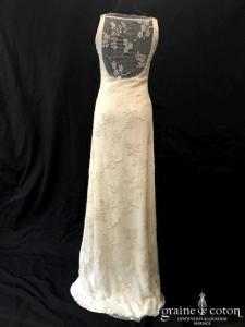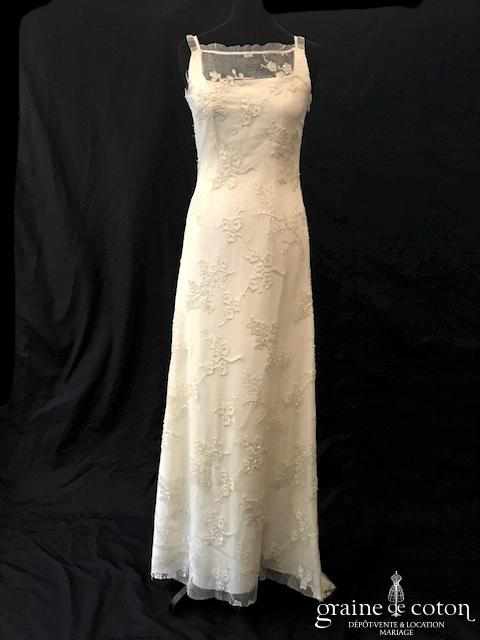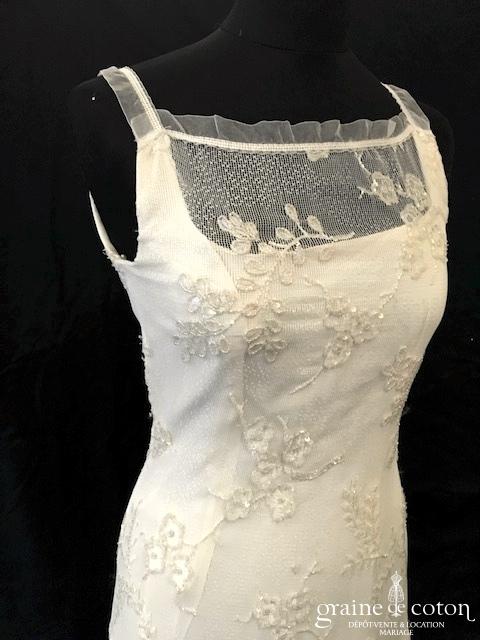 Robe une pièce tout en gaze de soie et dentelle délicatement perlée ivoire : encolure bateau, dos nu recouvert de dentelle. Jupe fluide droite, petite traîne. Classe et élégante.