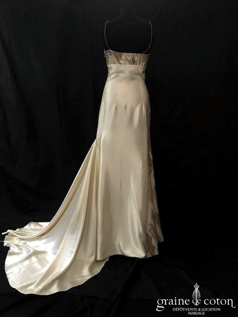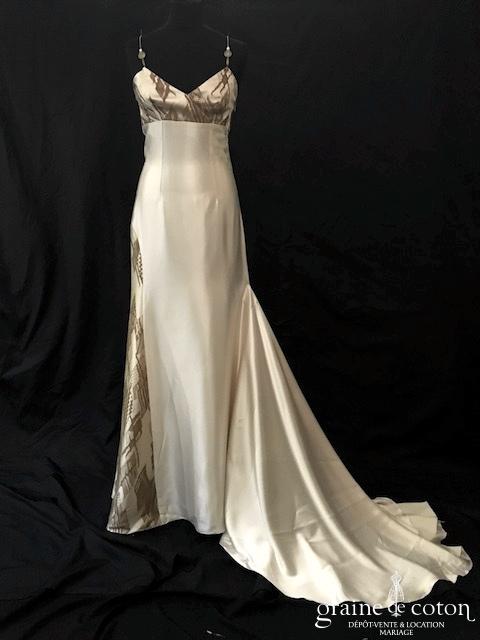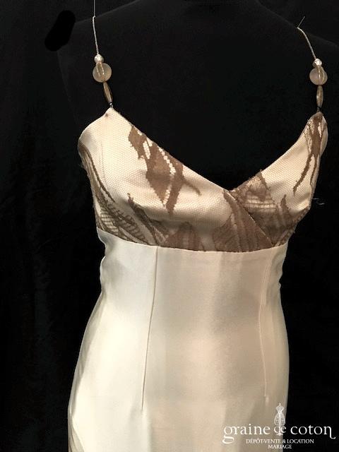 Robe une pièce en satin de soie ivoire et dentelle cappuccino : bustier empire avec fines bretelles-bijoux. Jupe ajustée fluide avec traîne sur le côté. Orignale, seyante, lumineuse.