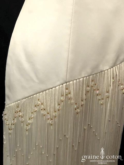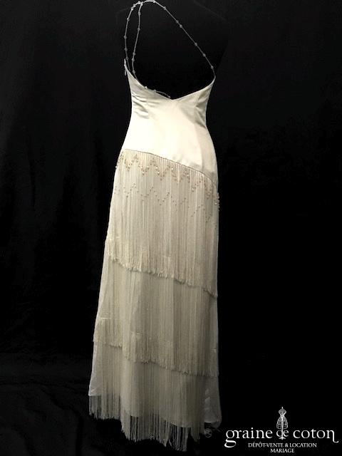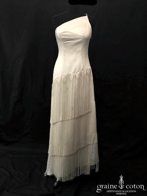 Robe une pièce en satin blanc : bustier asymétrique avec triple bretelle bijoux. Jupe taille basse avce franges, sans traîne, esprit années folles. Originale et seyante.