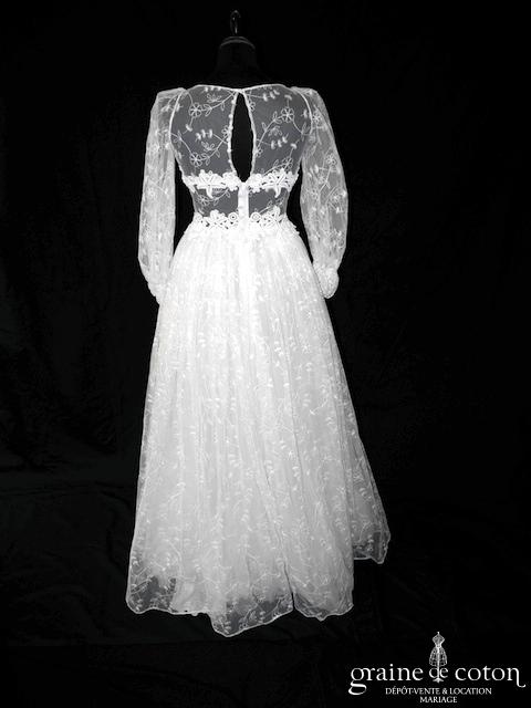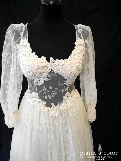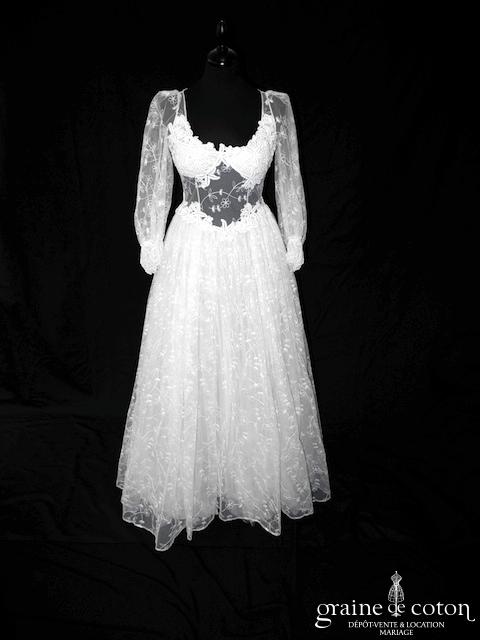 Robe une pièce ivoire : bustier en tulle bordé transparent, guipure de dentelle aux endroits stratégiques ;o) Dos boutonnée, manches longues finitions dentelle. Jupe évasée et fluide en tulle brodé, …