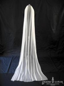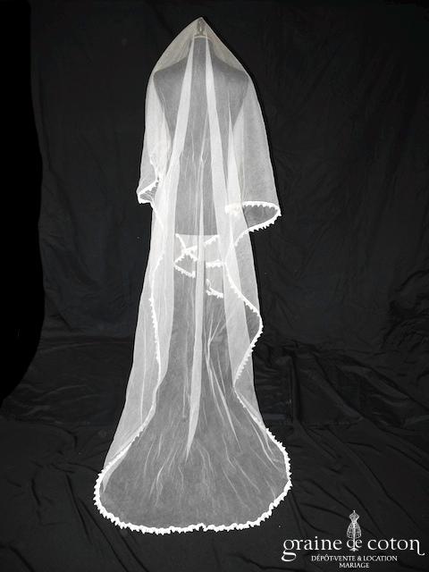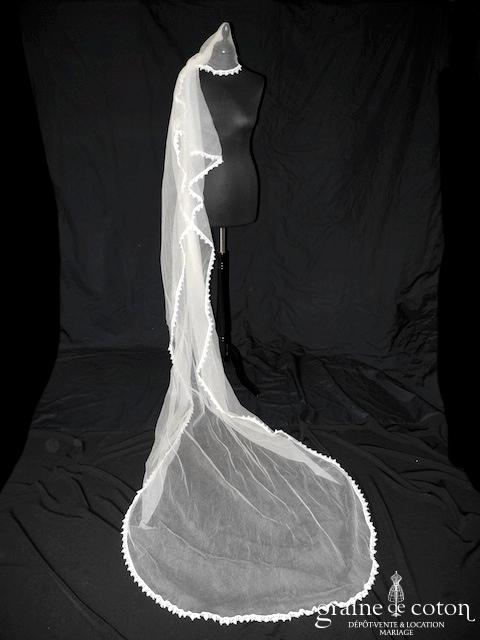 Voile Alena long de 3 mètres en tulle de soie ivoire bordé de dentelle de coton ravissante, non monté sur peigne. Vous pouvez donc choisir de mettre un rabat à …