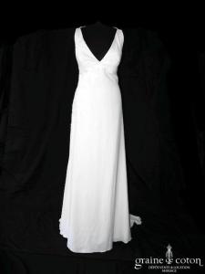 Robe une pièce en mousseline de soie et guipure ivoire : bustier empire coeur avec fines bretelles et manches partant du bas des épaules. Jupe fluide avec petite traîne. Féérique, …