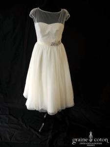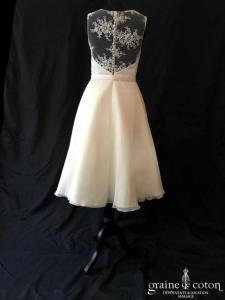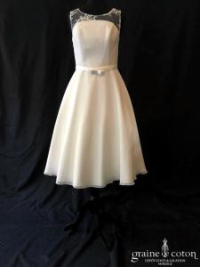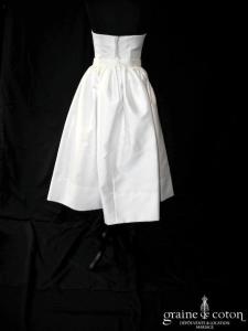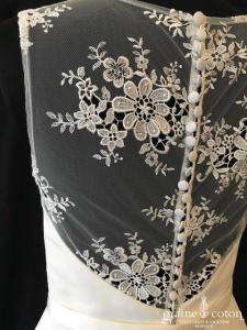 Robe une pièce blanche : décolleté carré bordé d’un galon rappelant la Rome antique. Épurée devant, elle se lace dans le dos et s’ouvre sur du tulle décoré de roses …