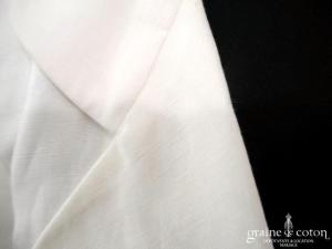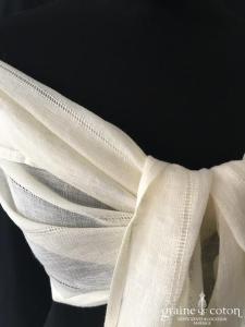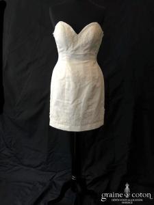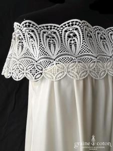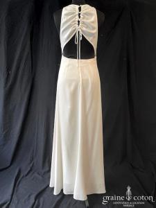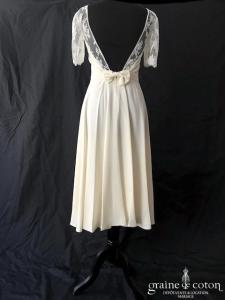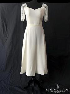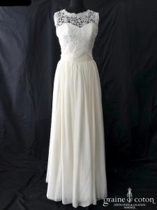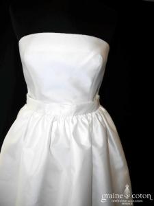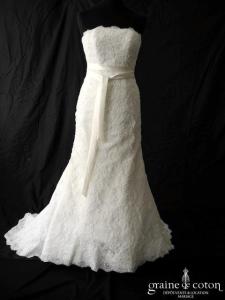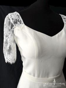 Robe simple et fluide en crêpe blanc : le décolleté est bordé de fleurs blanches qui se prolongent et forment les bretelles. Petite traîne. Raffinée et sans surcharge.