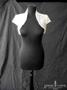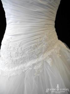 Robe une pièce blanche : bustier plissé et jupe avec dessous en tulle, courte devant. Possibilité d’appliquer de la dentelle fournie, posée pour le moment à l’épingle.