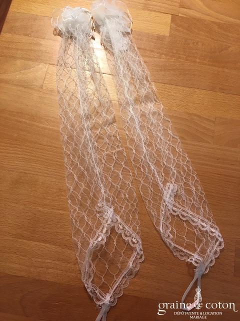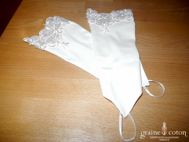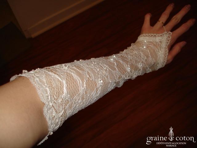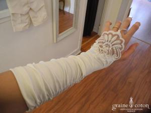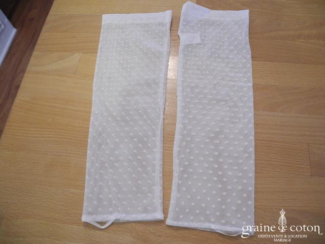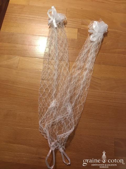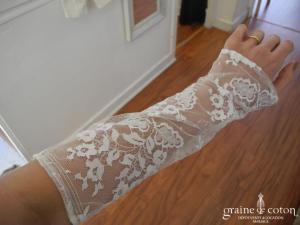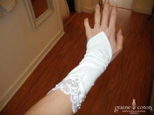 Mitaines mi longues (avant le coude) blanches avec élastique à passer au majeur. Très bonne tenue, beau rendu.