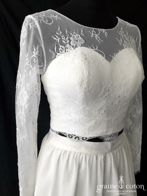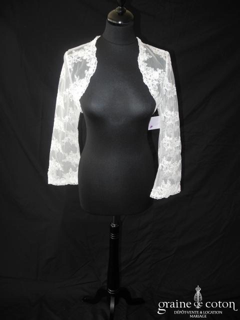 Boléro en fine dentelle de Chantilly ivoire à manches longues et encolure bateau. Raffiné et délicat.