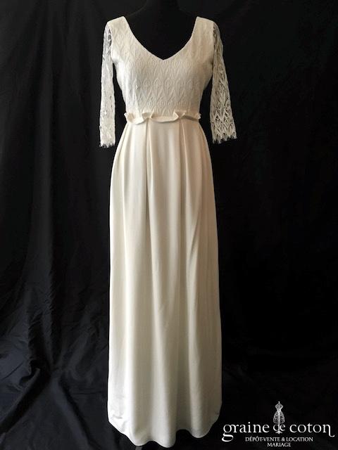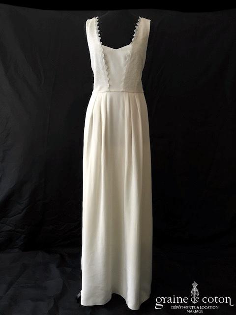 Robe une pièce ivoire : bustier en dentelle avec manches 3/4, dos nu. Jupe taille haute en crêpe de soie, boutonnée dans le dos, petite traîne. Légère, chic et bohème. …