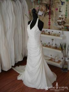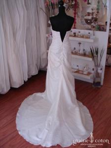 Robe une pièce tout en mikado ivoire clair : bustier encolure bateau (sur les épaules) largement échancrée dans le dos, avec noeud. Jupe cintrée sirène évasée sur le bas avec …