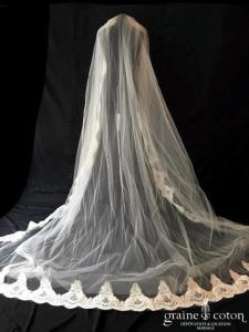 Robe une pièce ivoire clair : top en dentelle ivoire et ivoire clair, bretelles et dos nu. Jupe taille haute en crêpe doublé de tulle plumetis plissé soleil. Petite traîne …