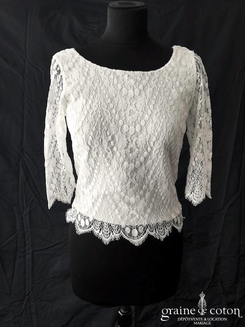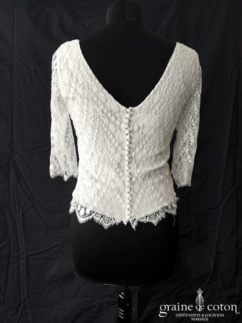 Top en fine dentelle et petites manches, dos ouvert, doublé sur l’avant.