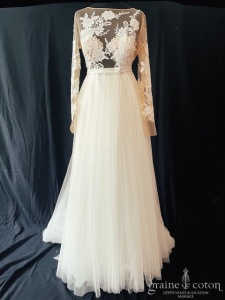 Combinaison une pièce : top en tulle et dentelle avec manches longues, dos entièrement boutonné avec effet tatouage. Pantalon à jambes larges en crêpe fluide. Sur-jupe en tulle pour avoir …