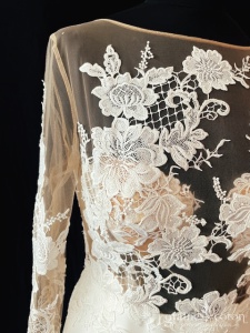 Combinaison une pièce : top en tulle et dentelle avec manches longues, dos entièrement boutonné avec effet tatouage. Pantalon à jambes larges en crêpe fluide. Originale et élégante, idéale pour …
