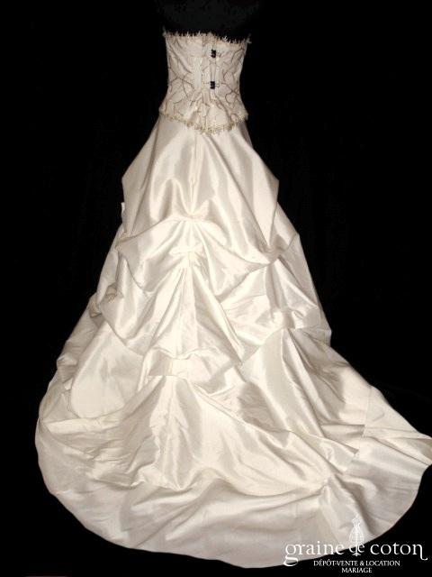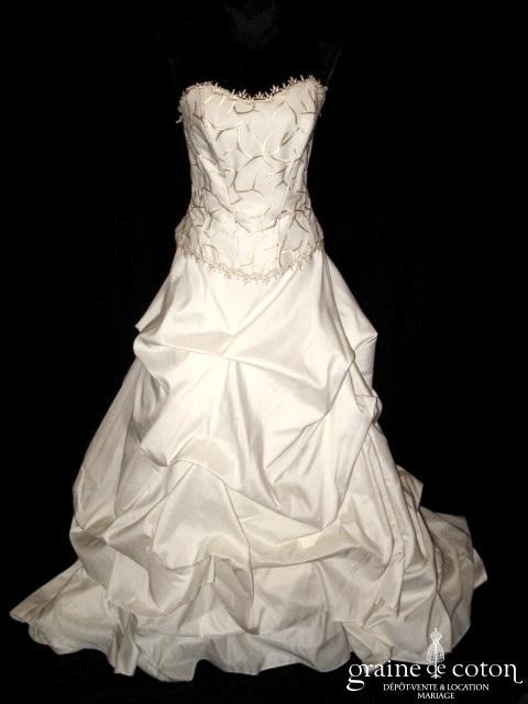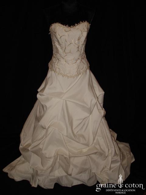 Robe deux pièces ivoire : bustier brodé de motifs dorés et bordé de dentelle, jupe trapèze en taffetas ivoire, remontée par endroits pour un effet « nuage ». Housse et jupon inclus. …