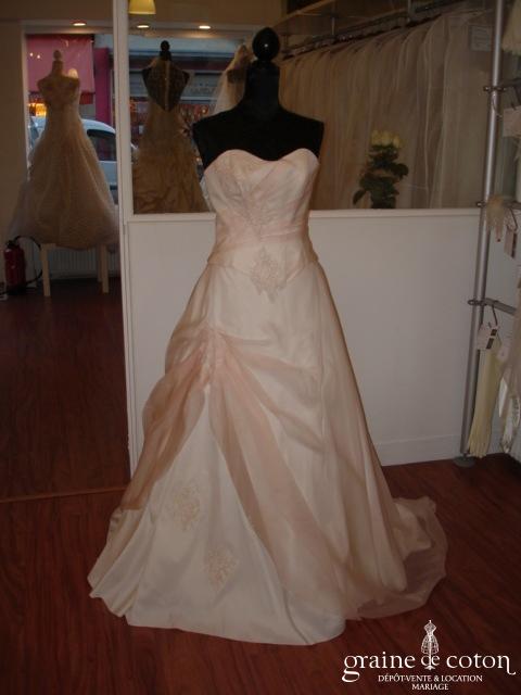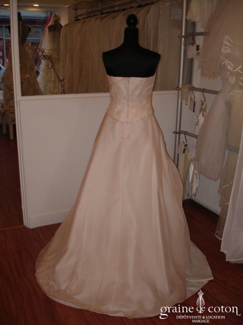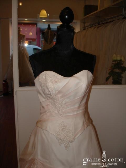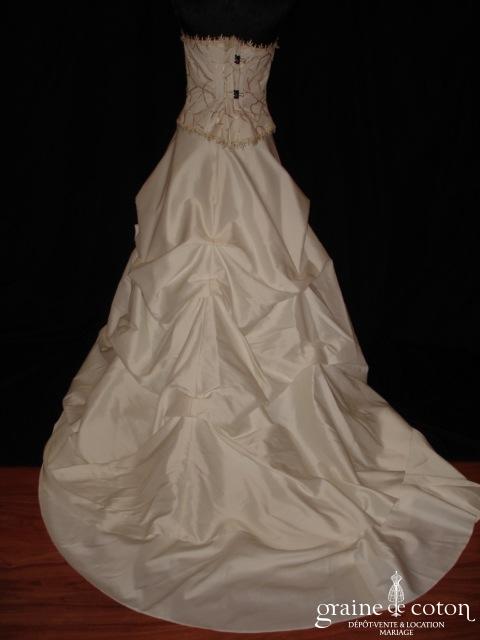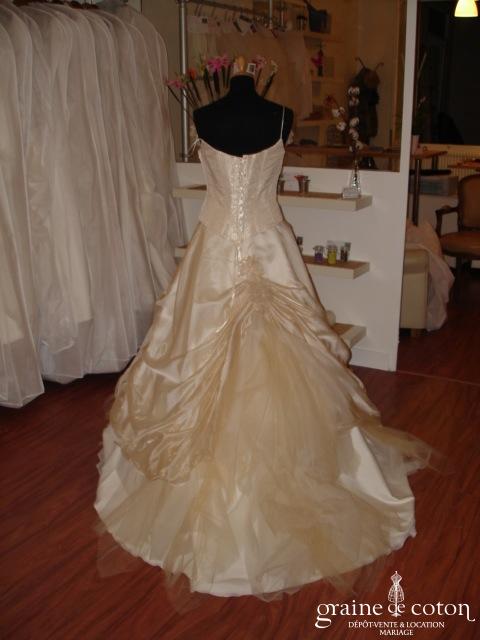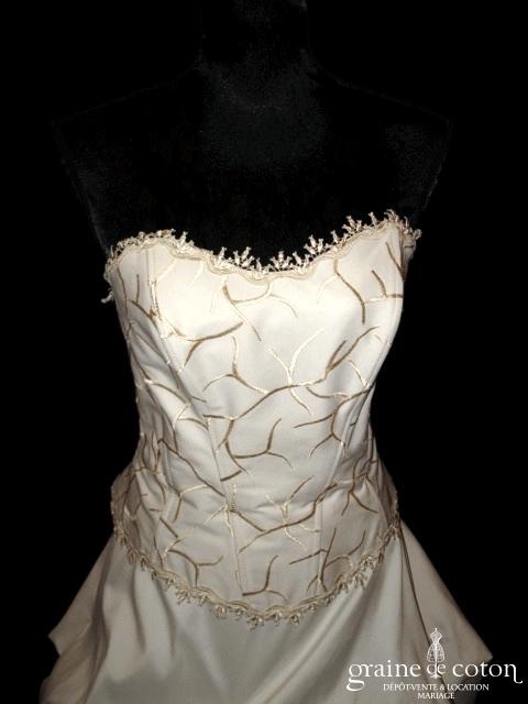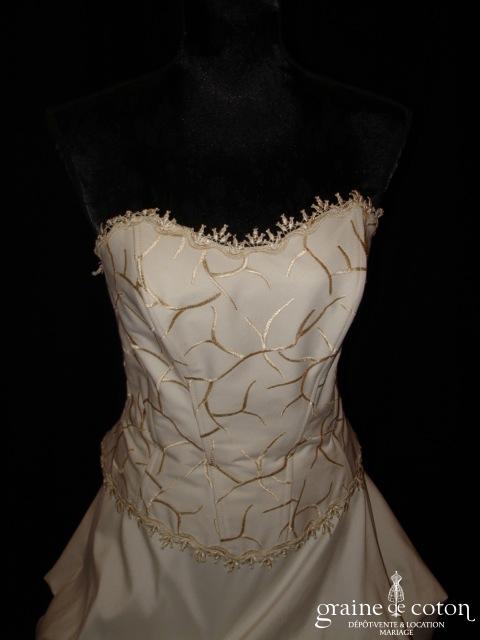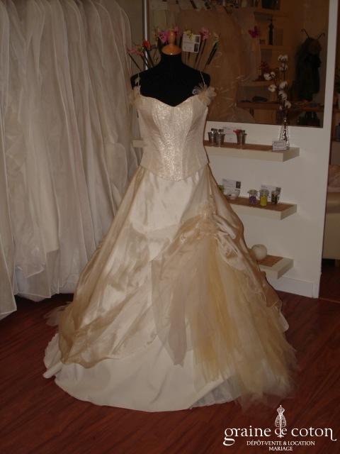Robe deux pièces couleur ivoire et champagne. Bustier lacé sur les côtés, en pointe pour affiner encore la taille. Jupe ivoire relevée par des petites fleurs, effet « nuage ».