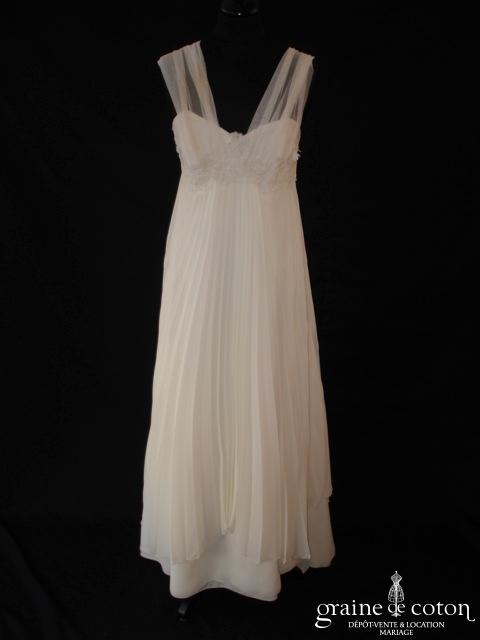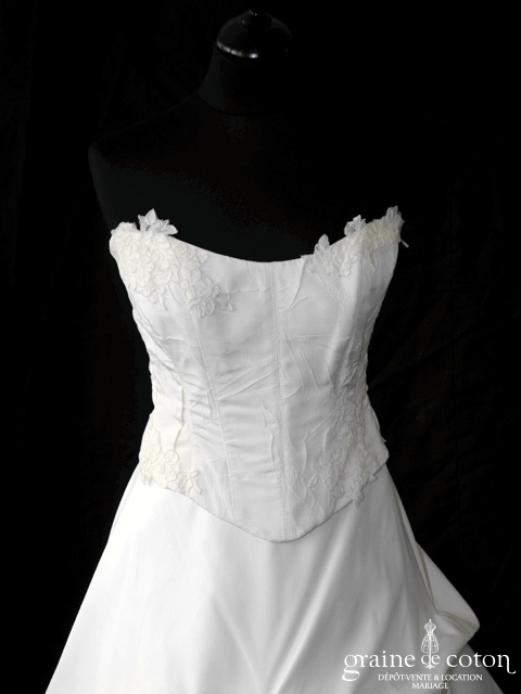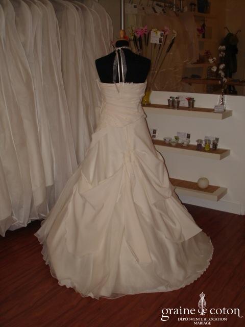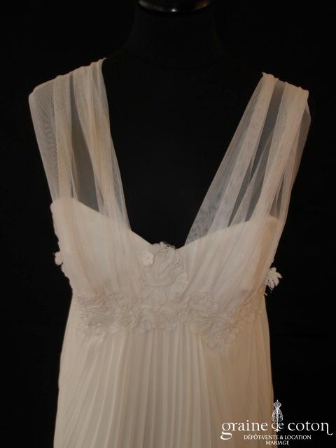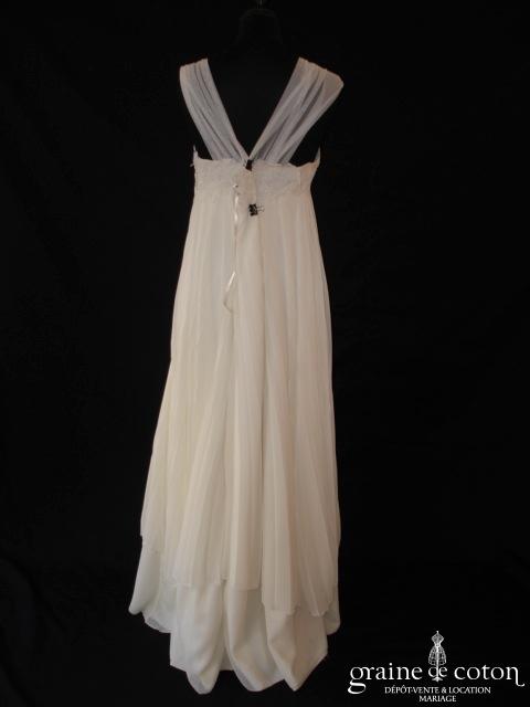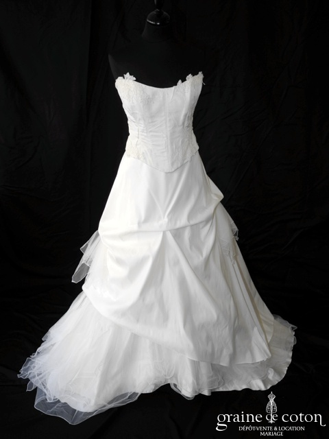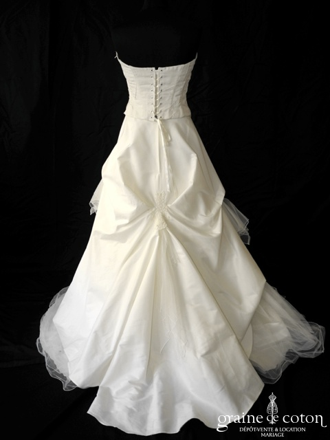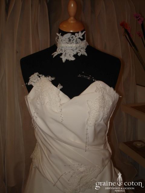 Robe deux pièces couleur ivoire : bustier effet froissé avec guipure de dentelle et dos lacé. Jupe relevée par endroit avec alternance asymétrique de tissu, de mouchoirs de tulle et …