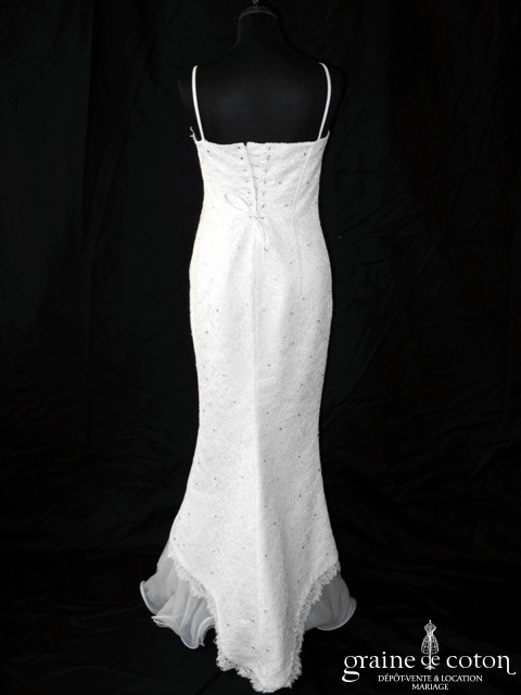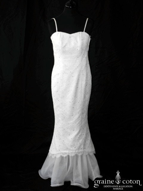 Robe une pièce en dentelle ivoire : bustier avec fines bretelles pouvant se retirer, dentelle pailletée. Jupe sirène s’évasant en volutes de tulle, pas de traîne. Robe légère et sexy …