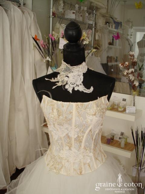 Robe deux pièces : bustier ivoire et doré, avec de petites plumes, guipure de dentelle et baleines apparentes. Jupe faite de plusieurs couches de tulle, longue traîne qui se remonte …