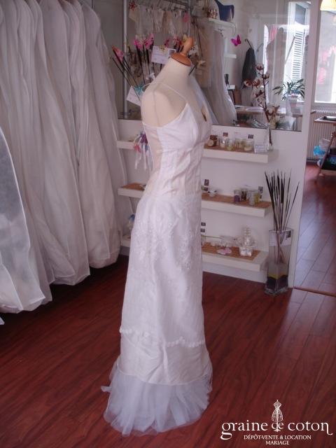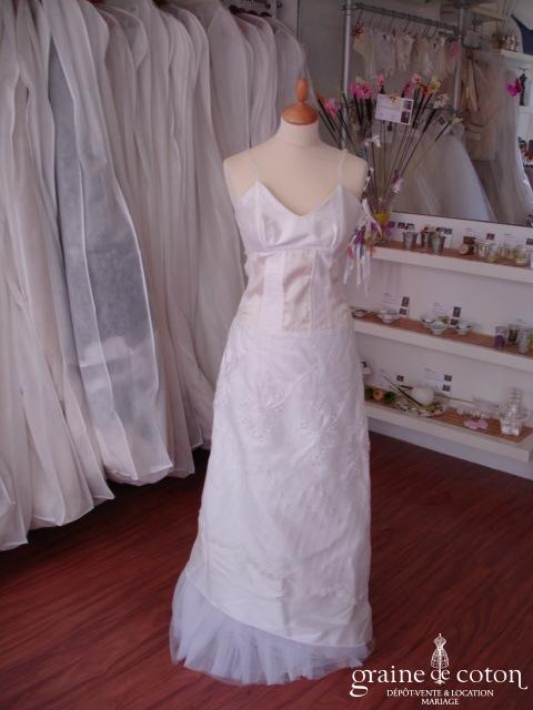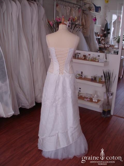 Robe une pièce ivoire : bustier baleiné en soie sauvage et voile transparent, dos ouvert lacé. Jupe longue près du corps en tissu brodé et jupon de tulle apparent sur …