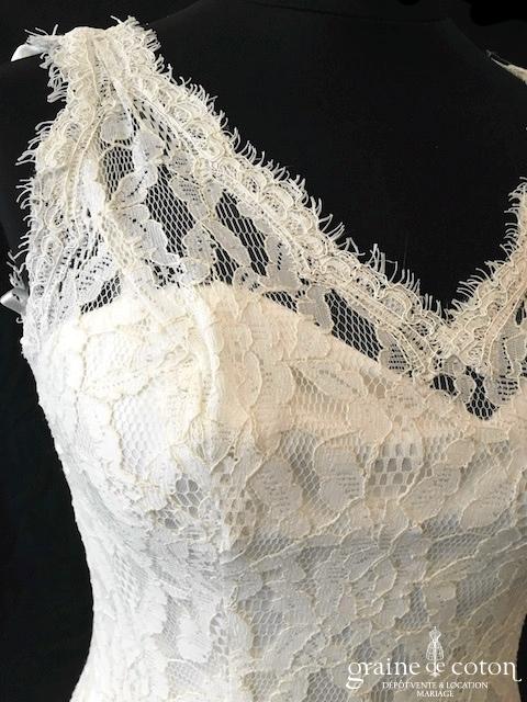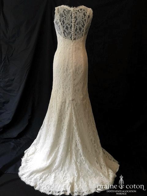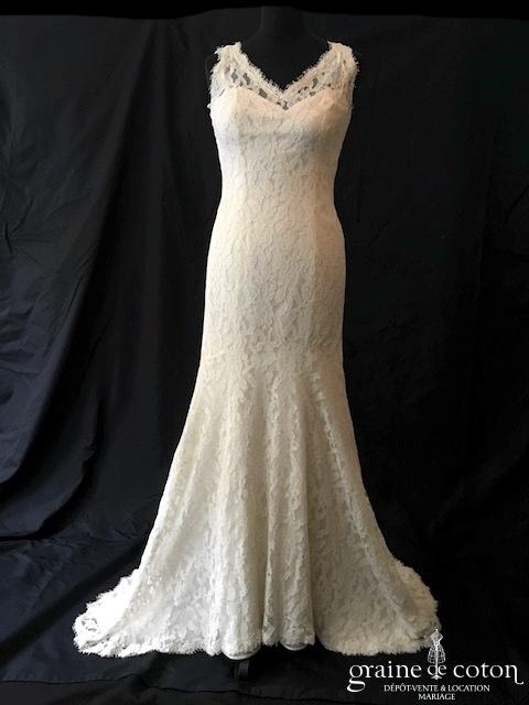 Robe une pièce ivoire clair : top en dentelle encolure montante, manches longues. Dos tout en dentelle et tulle boutonné, effet nu. Jupe fourreau en crêpe de soie fluide, traîne. …