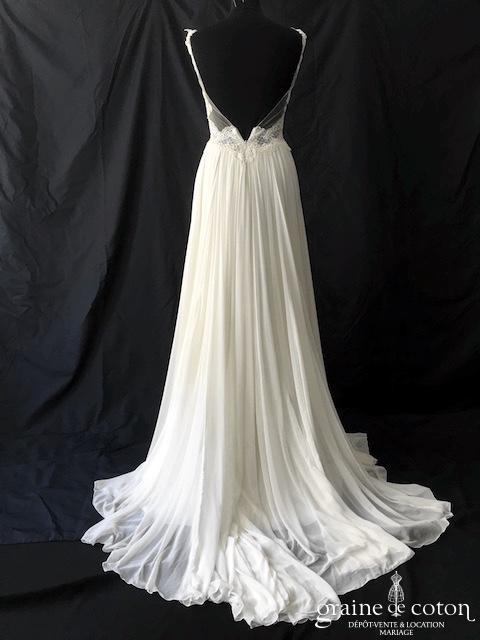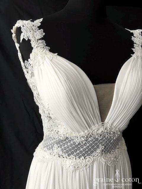 Robe une pièce ivoire clair : bustier baleiné en tulle recouvert de dentelle, effet tatouage. Petites manches tombantes sur les épaules. Jupe taille haute fluide en mousseline avec rappel de …