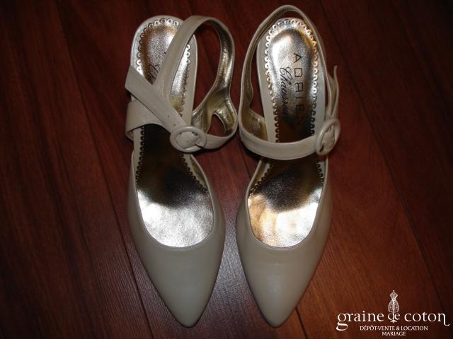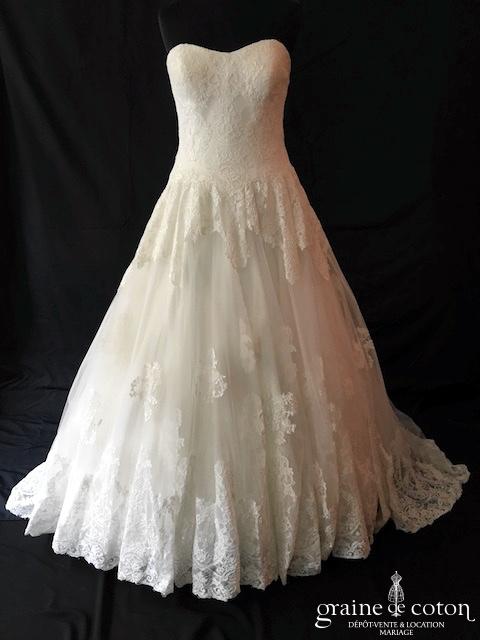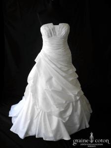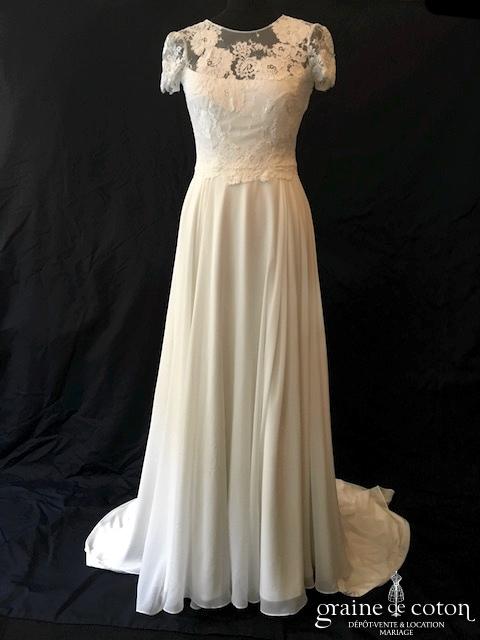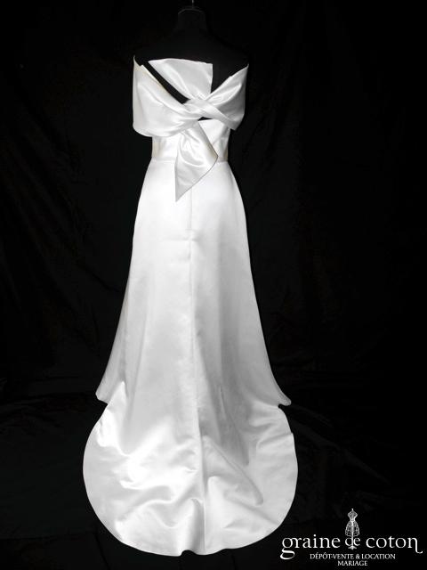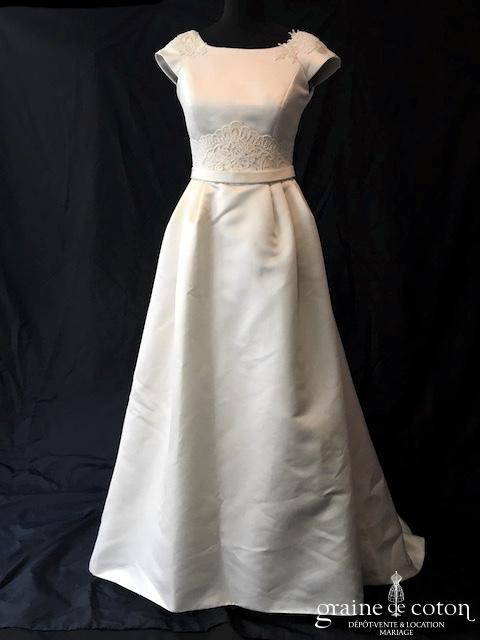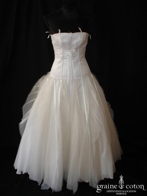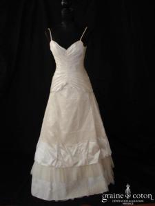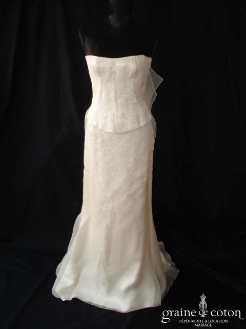 Robe deux pièces ivoire : bustier drapé décolleté coeur en soie laquée, lacé au dos. Jupe en soie et dentelle avec drapés asymétriques. Très belles matières, modèle de grande originalité. …