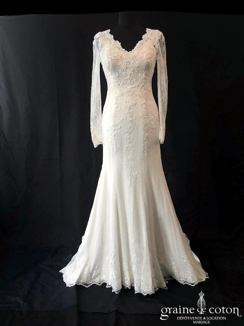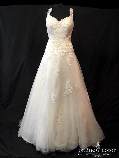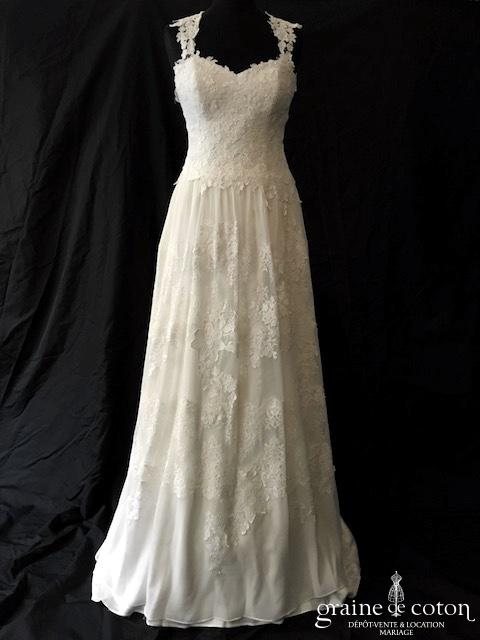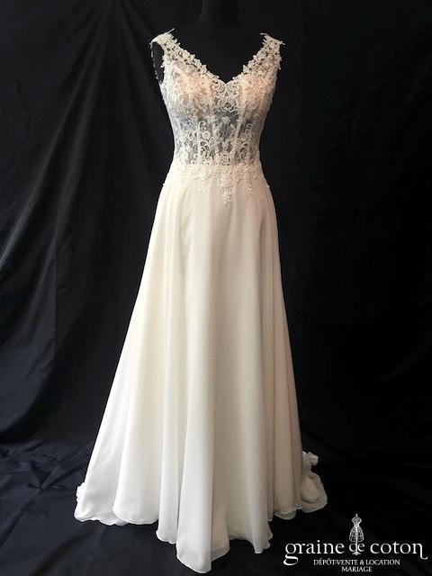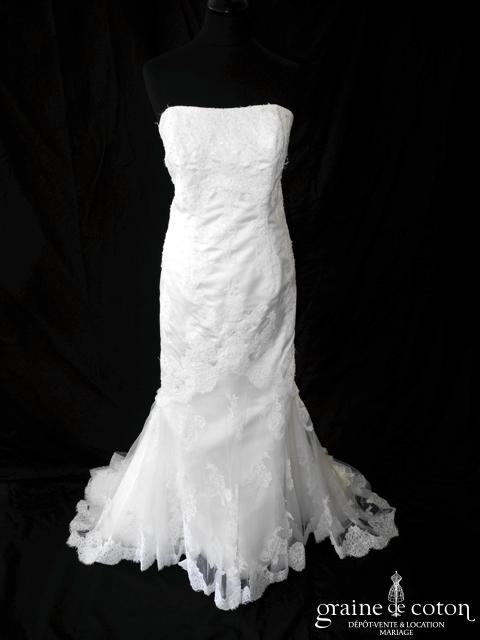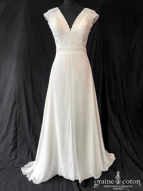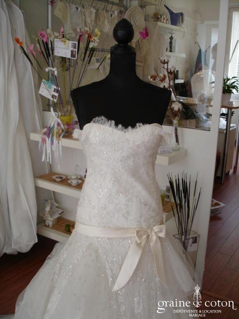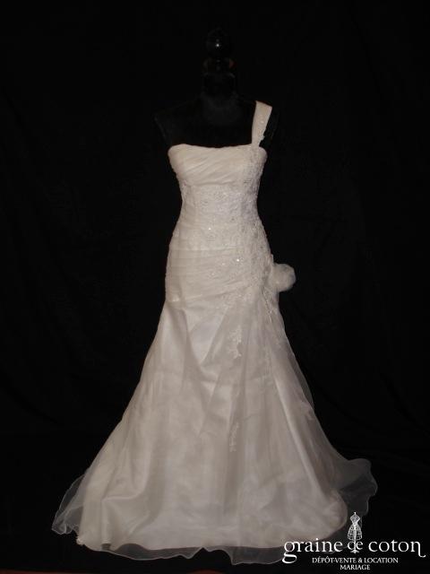 Robe une pièce en organza ivoire : bustier avec guipure de dentelle taille basse, une seule bretelle, dos boutonné. Beau drapé d’organza sur le décolleté. Jupe sirène s’évasant avec longue …