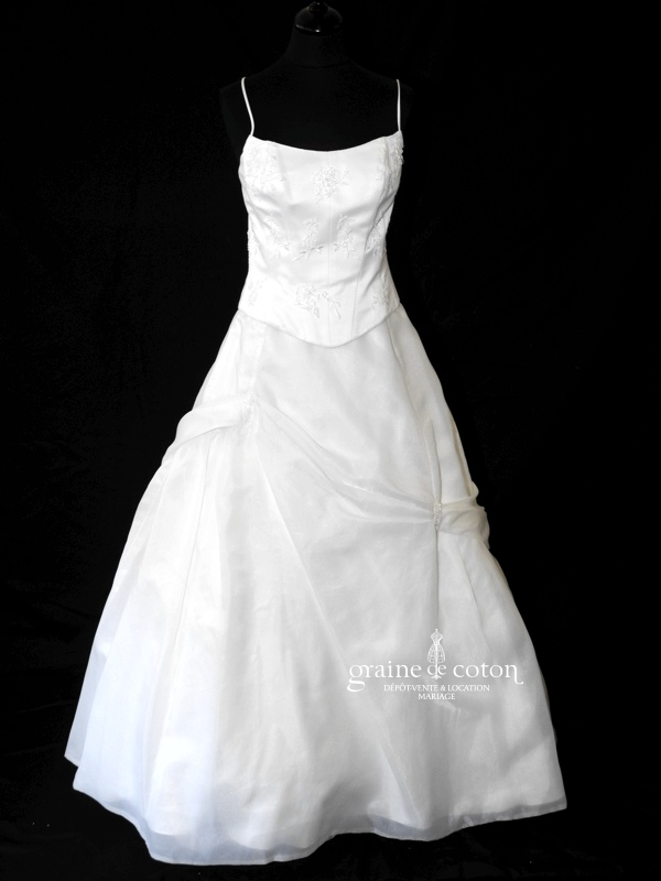 Robe deux pièces blanche : bustier recouvert d’une fine dentelle, petites bretelles amovibles. Jupe ample drapée d’organza relevé par endroit avec de petites perles. Jupon et housse inclus.