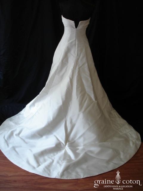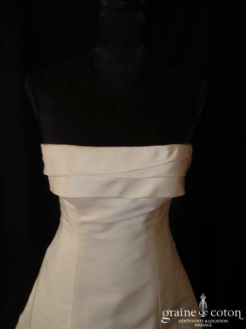Robe une pièce en mikado de soie ivoire : bustier droit orné d’une bande de fines perles le long du décolleté. Jupe taille basse largement évasée, façon boule, avec plis …