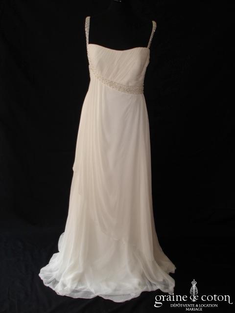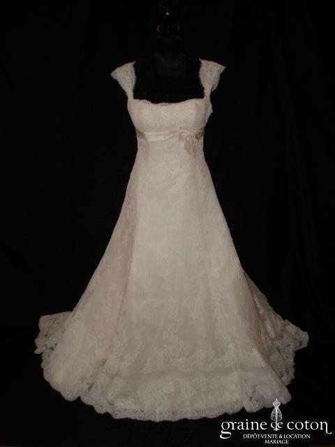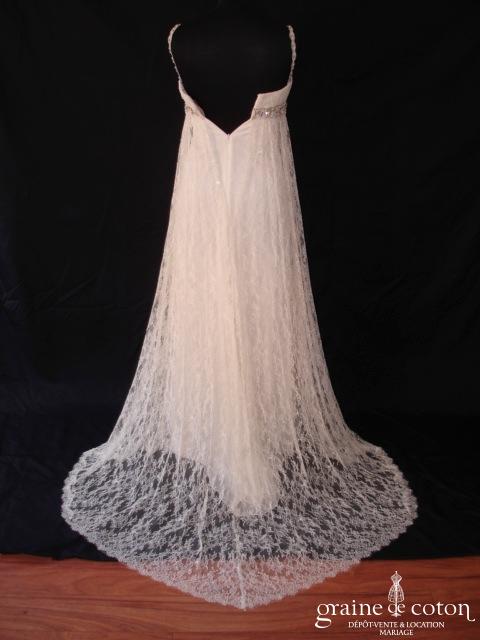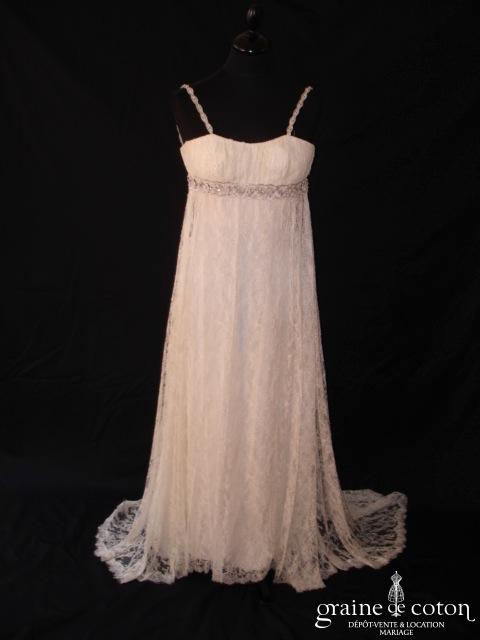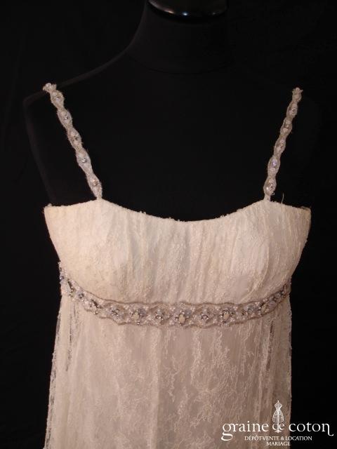 Robe une pièce tout en fine dentelle de Calais ivoire : bustier taille empire avec fines bretelles, souligné d’une ceinture de strass discrets. Jupe fluide avec petite traîne. Entièrement doublée …